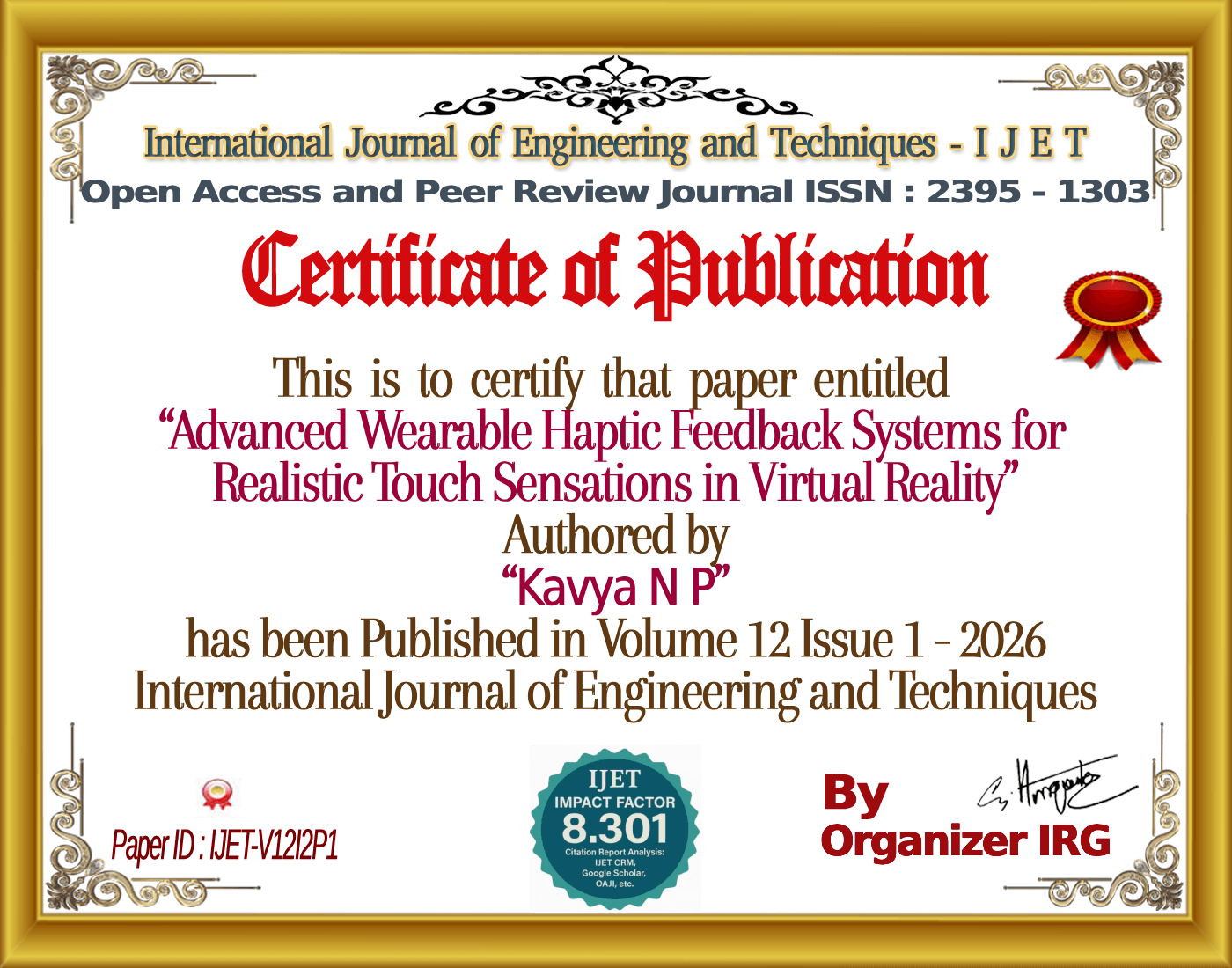 Kavya N P, Ms. Divya P (March 2026). Advanced Wearable Haptic Feedback Systems for Realistic Touch Sensations in Virtual Reality. International Journal of Engineering and Techniques (IJET), 12(2). https://zenodo.org/records/18845709