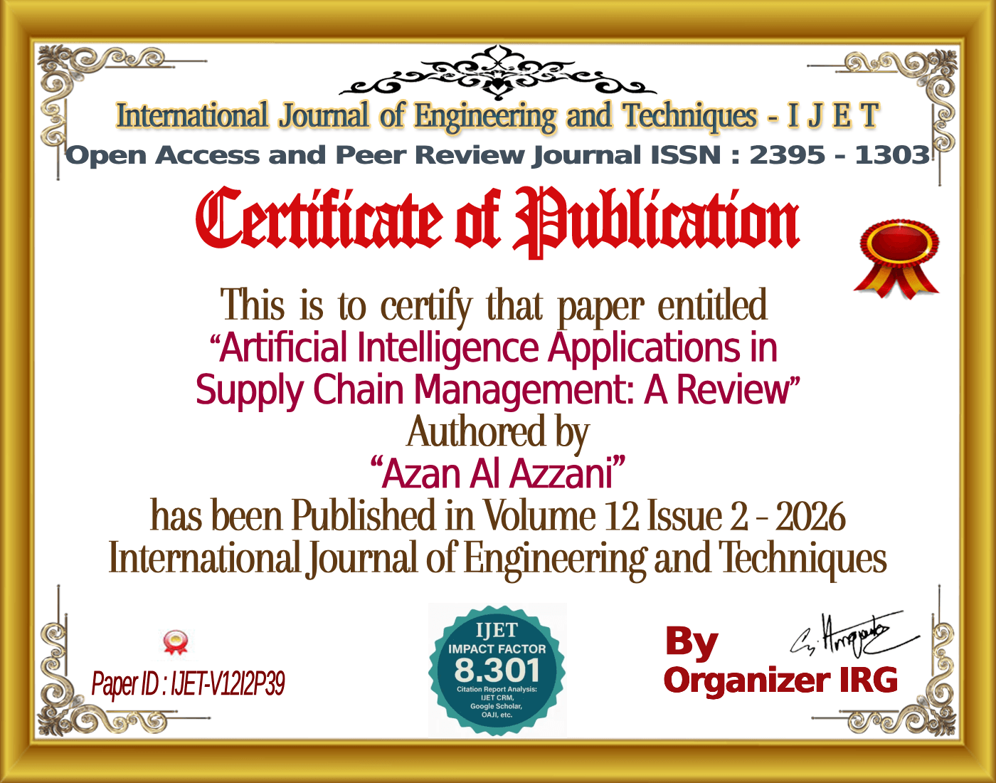 Azan Al Azzani, “Artificial Intelligence Applications in Supply Chain Management: A Review,” International Journal of Engineering and Techniques (IJET), vol. 12, no. 2, March 2026, doi: {{doi}}.