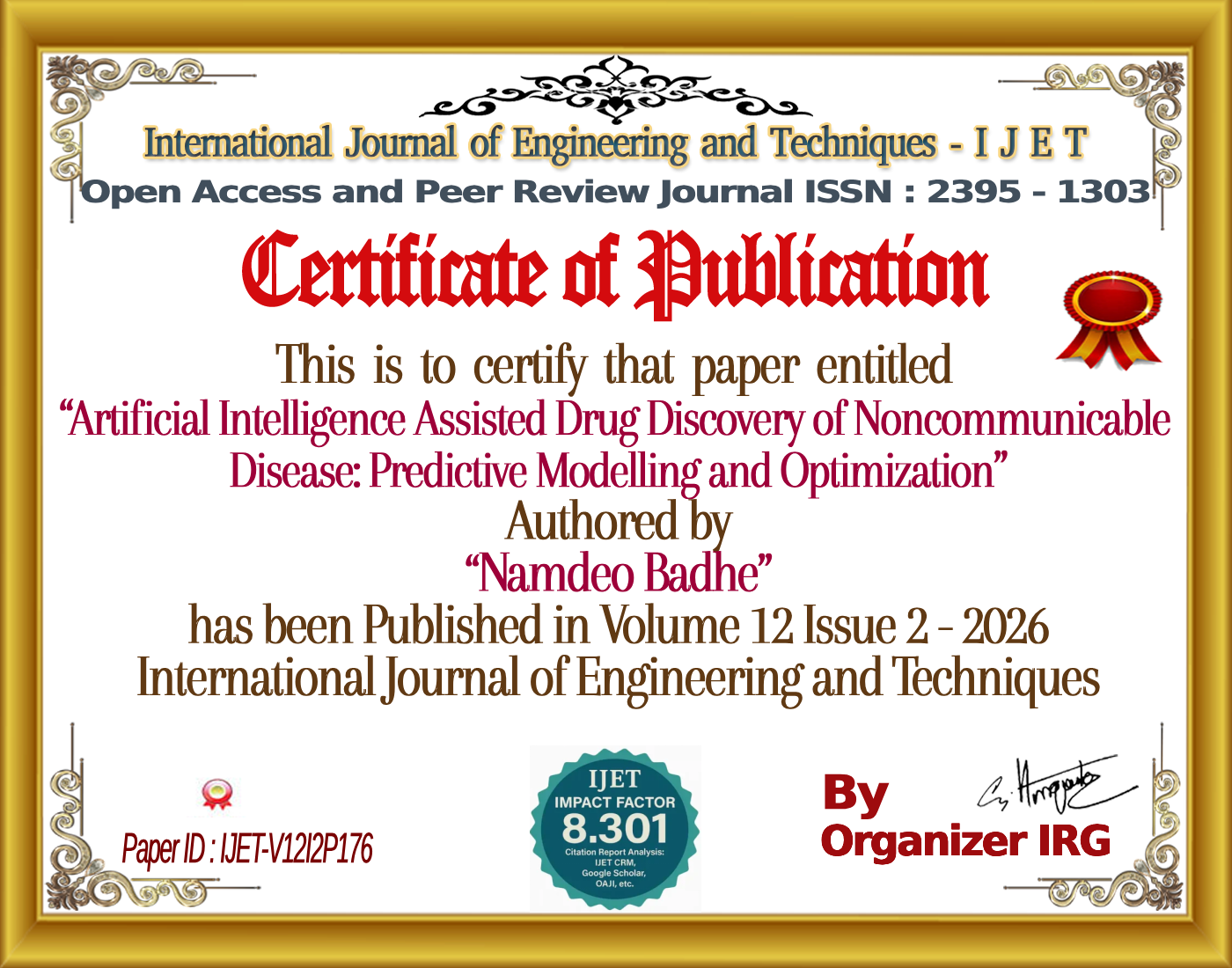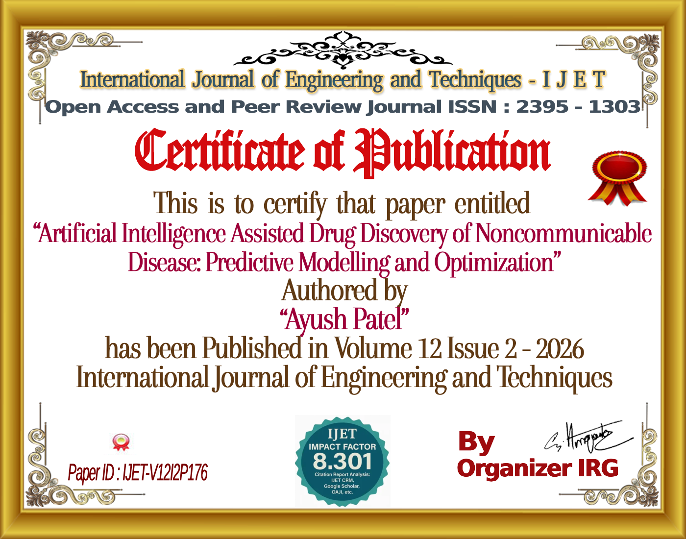 Ayush Patel, Sangeeta Vhatkar, Namdeo Badhe, âArtificial Intelligence Assisted Drug Discovery of Noncommunicable Disease: Predictive Modelling and Optimization,â International Journal of Engineering and Techniques (IJET), vol. 12, no. 2, April 2026, doi: {{doi}}.