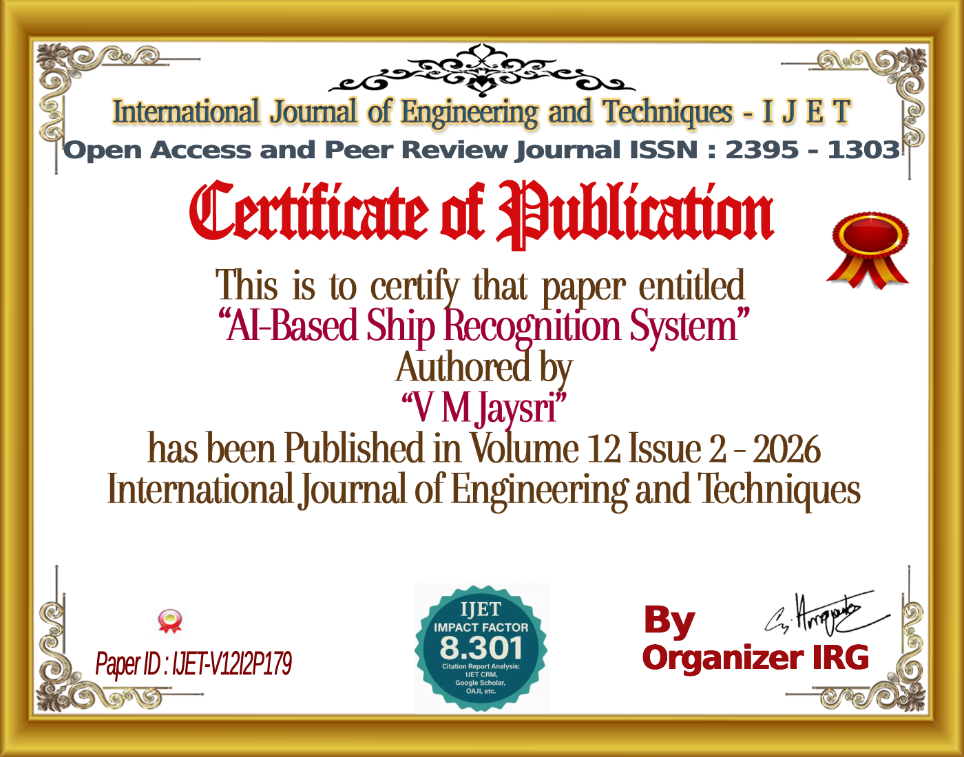 Dr.G. Arulkumaran, V M Jaysri, P V R Sneha, Cinchana P K, Rishik Raj (April 2026). AI-Based Ship Recognition System. International Journal of Engineering and Techniques (IJET), 12(2). https://doi.org/{{doi}}