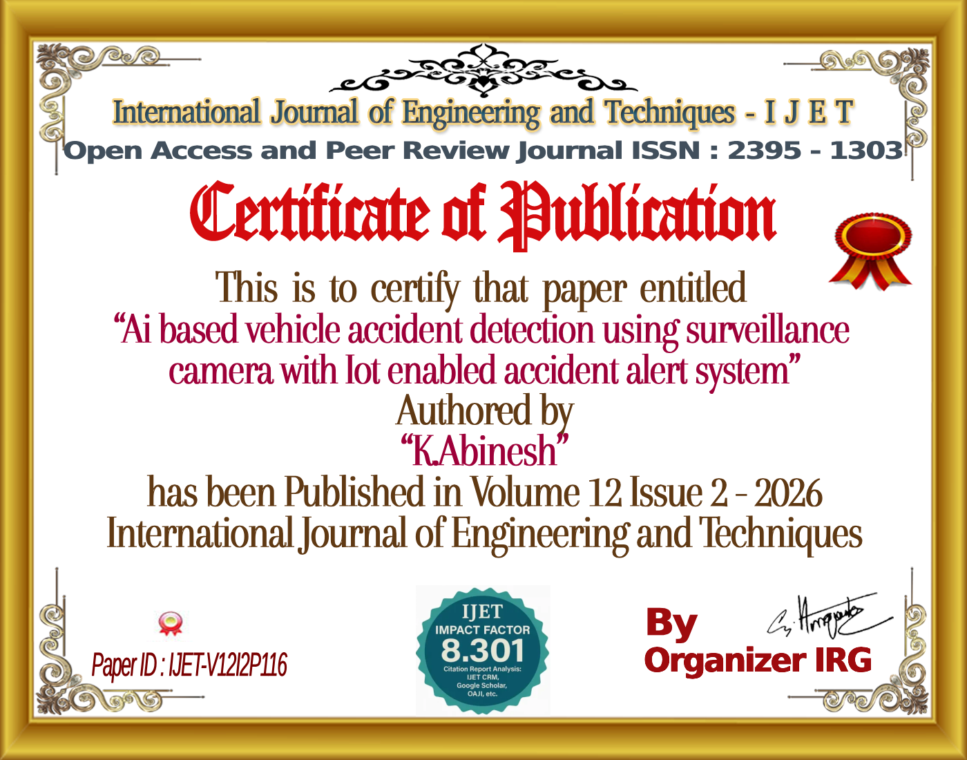 To overcome this problem, this project proposes an AI-based vehicle accident detection system using surveillance cameras with an IoT-enabled accident alert system. The system uses computer vision and deep learning techniques to monitor live video from surveillance cameras and automatically detect accidents in real time.