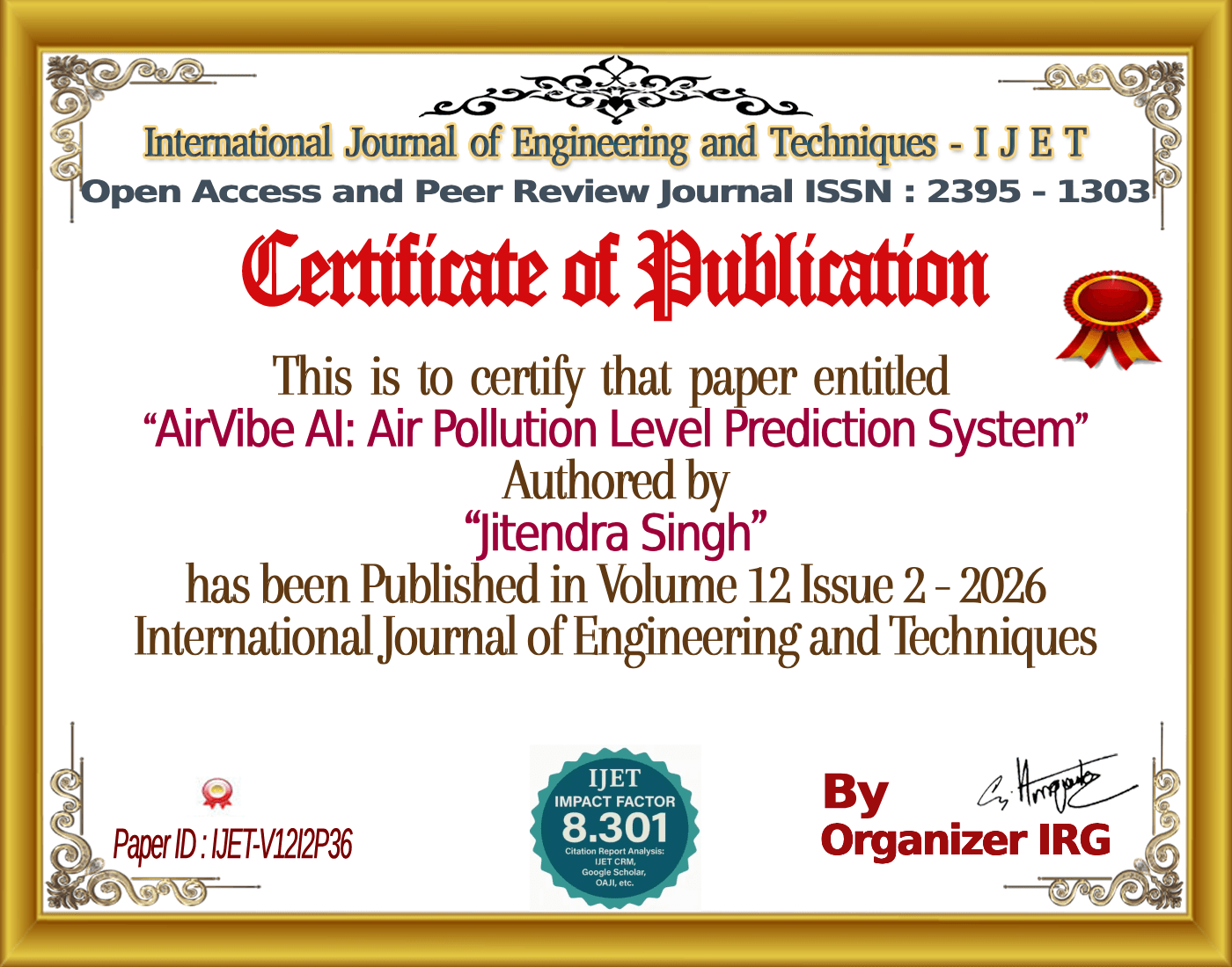 Rudra Mishra, Jitendra Singh, Mr. Rajeev Srivastava, Rajeev Srivastava, “AirVibe AI: Air Pollution Level Prediction System,” International Journal of Engineering and Techniques (IJET), vol. 12, no. 2, March 2026, doi: {{doi}}.