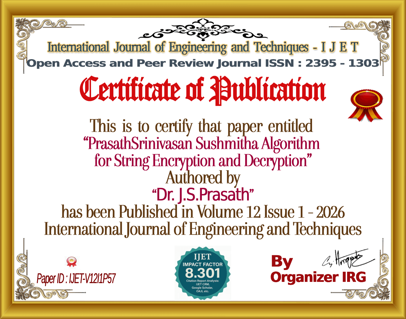 Dr. J.S.Prasath, Ms. Sushmitha G S (February 2026). PrasathSrinivasan Sushmitha Algorithm for String Encryption and Decryption. International Journal of Engineering and Techniques (IJET), 12(1). https://zenodo.org/records/18744152