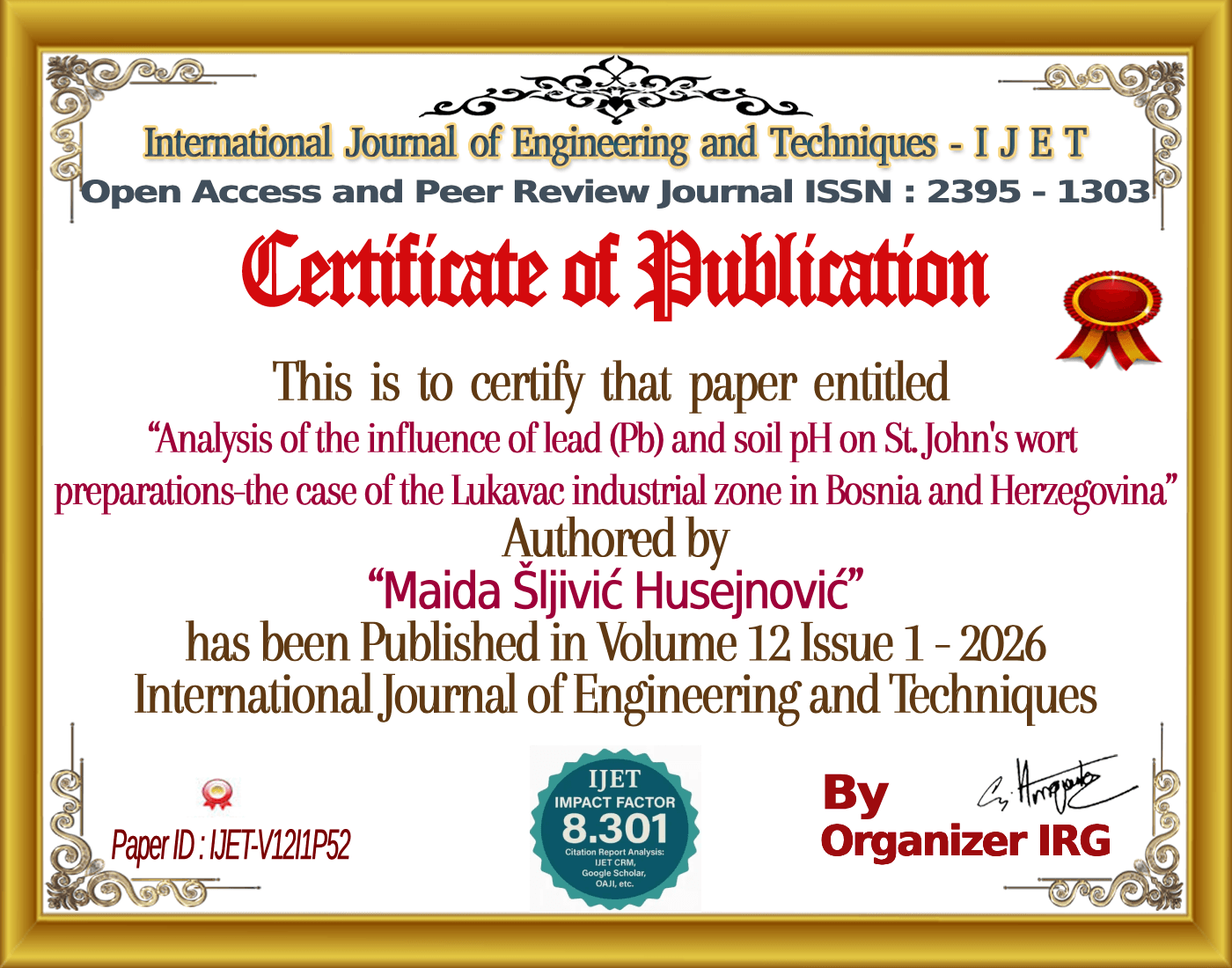 Azra Suljic, Ervina Becic, Maida Å ljiviÄ HusejnoviÄ, Nedim Suljic, āAnalysis of the influence of lead (Pb) and soil pH on St. John’s wort preparations – the case of the Lukavac industrial zone in Bosnia and Herzegovina,ā International Journal of Engineering and Techniques (IJET), vol. 12, no. 1, February 2026, doi: https://zenodo.org/records/18725295.