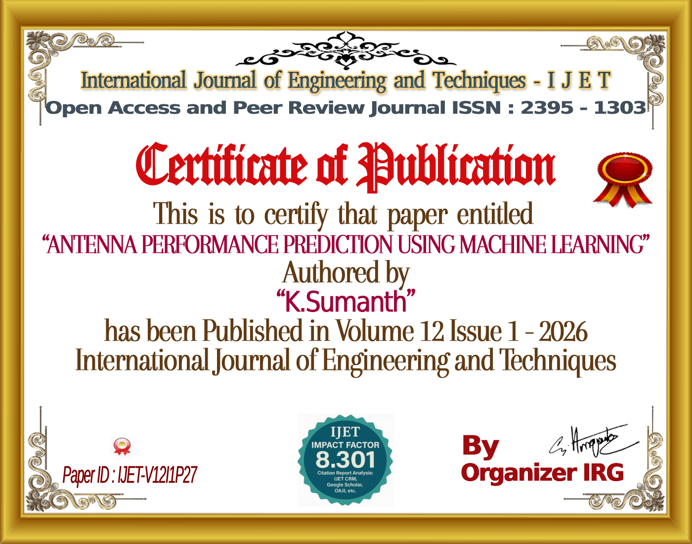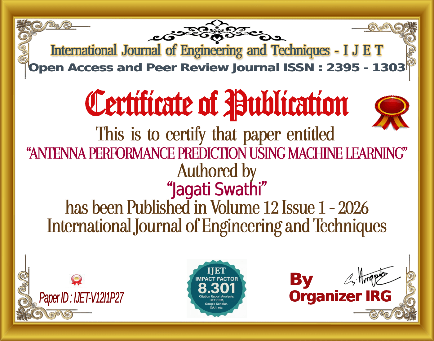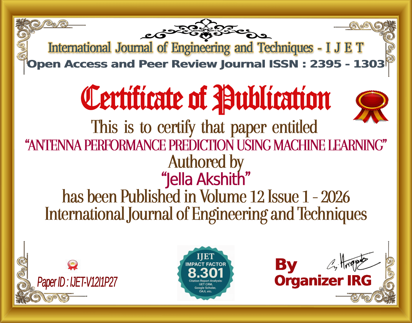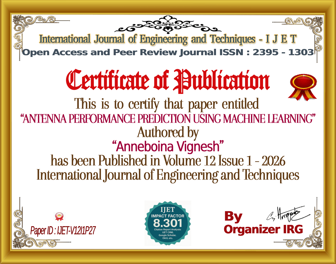 Jagati Swathi, Anneboina Vignesh, Danda Avinash reddy, Jella Akshith, K.Sumanth, Dr. Venkataramana.B, âANTENNA PERFORMANCE PREDICTION USING MACHINE LEARNING,â International Journal of Engineering and Techniques (IJET), vol. 12, no. 1, February 2026, doi: https://zenodo.org/records/18525276.