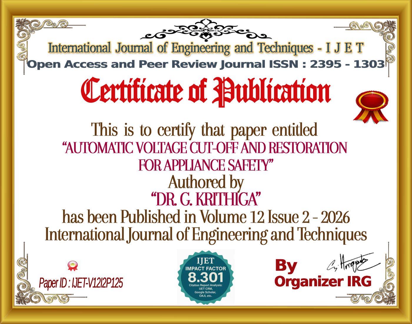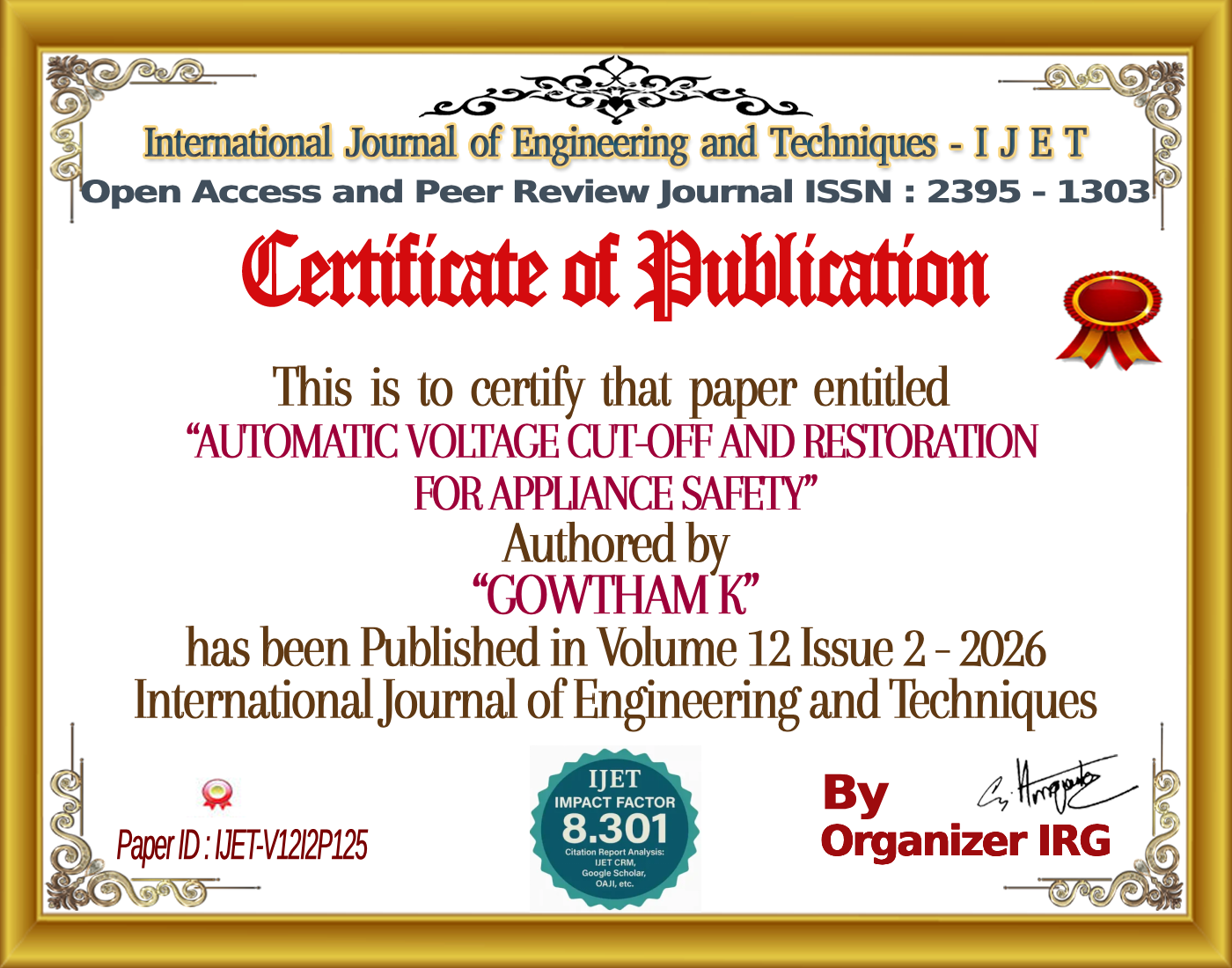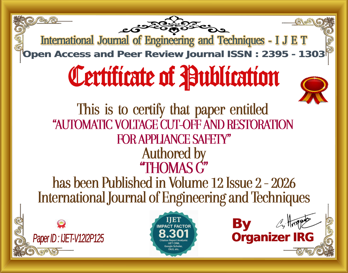 AUTOMATIC VOLTAGE CUT-OFF AND RESTORATION FOR APPLIANCE SAFETY | IJET – Volume 12 Issue 2 | IJET-V12I2P125