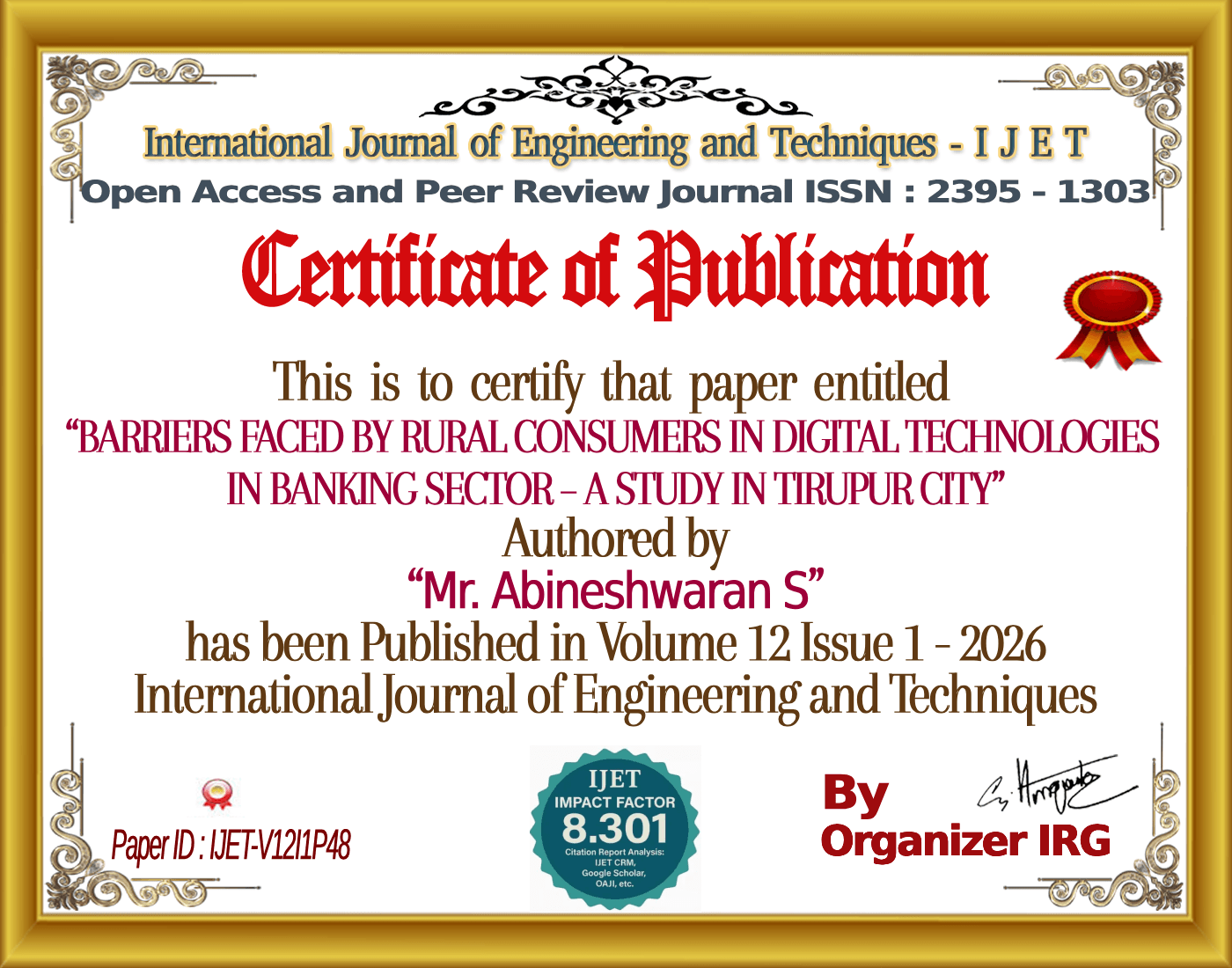 Mr. V. Deepak, Mr. Abineshwaran S, “BARRIERS FACED BY RURAL CONSUMERS IN DIGITAL TECHNOLOGIES IN BANKING SECTOR – A STUDY IN TIRUPUR CITY,” International Journal of Engineering and Techniques (IJET), vol. 12, no. 1, February 2026, doi: https://zenodo.org/records/18709205.