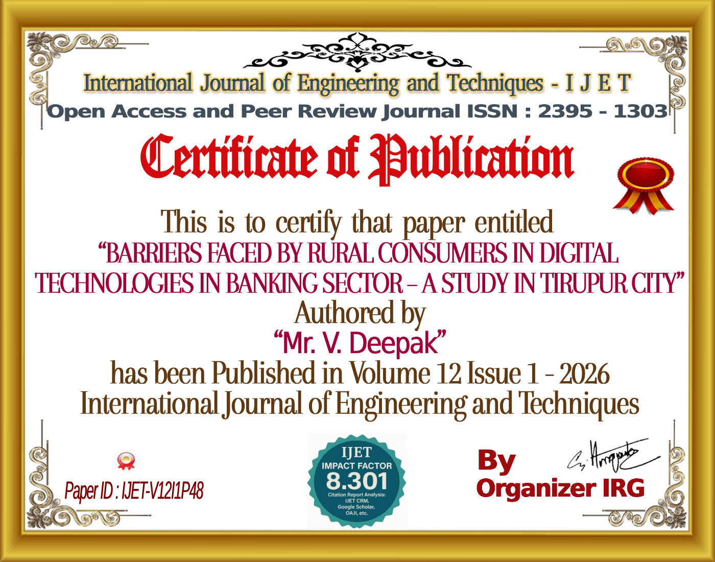 Mr. V. Deepak, Mr. Abineshware, “BARRIERS FACED BY RURAL CONSUMERS IN DIGITAL TECHNOLOGIES IN BANKING SECTOR – A STUDY IN TIRUPUR CITY,” International Journal of Engineering and Techniques (IJET), vol. 12, no. 1, February 2026, doi: https://zenodo.org/records/18709205.