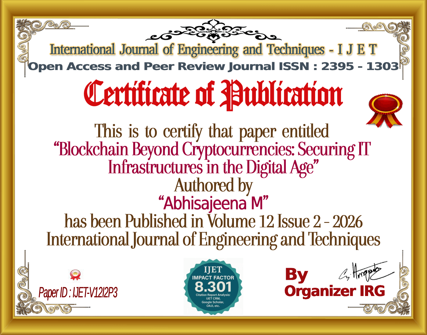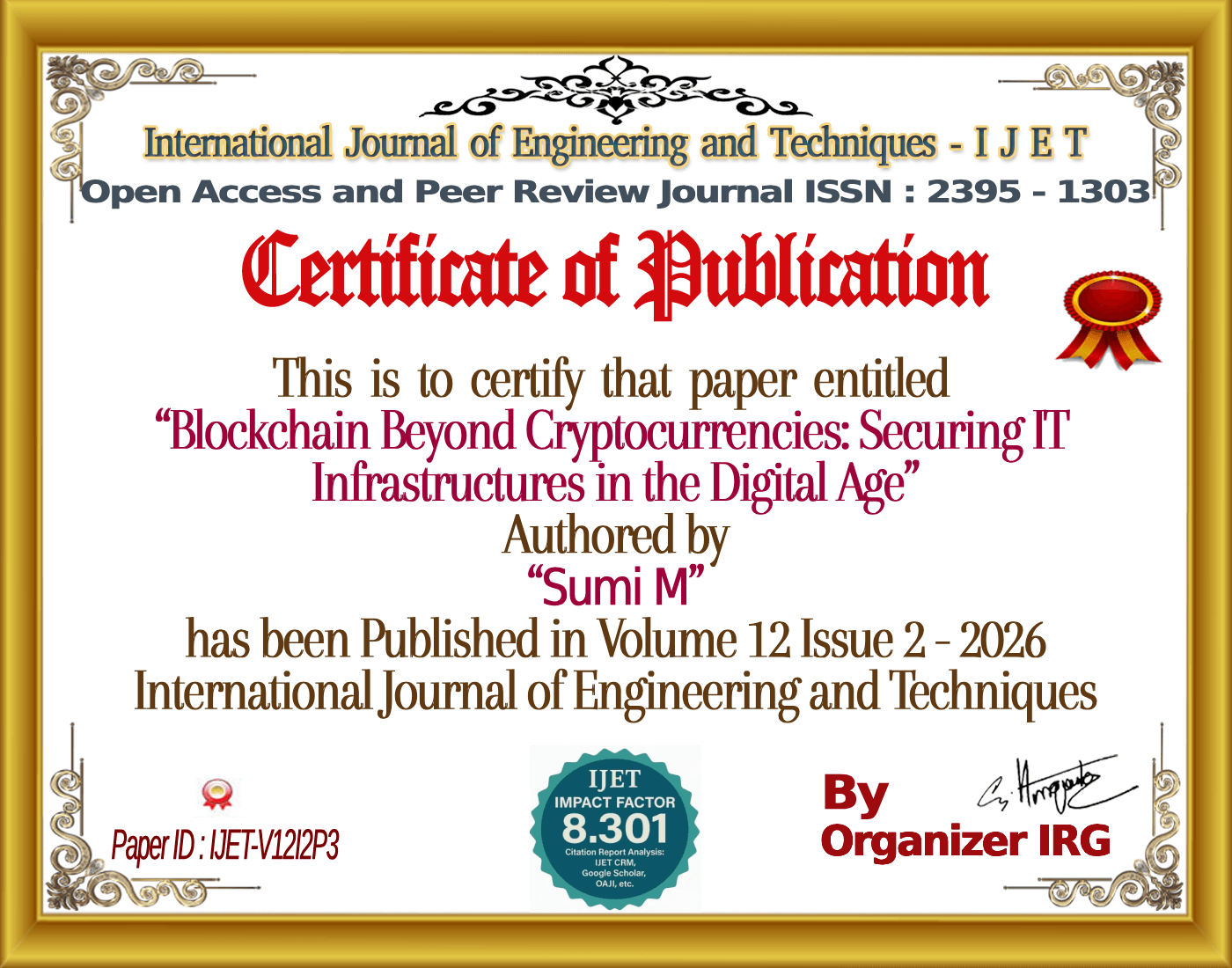 Abhisajeena M, Sumi M, “Blockchain Beyond Cryptocurrencies: Securing IT Infrastructures in the Digital Age,” International Journal of Engineering and Techniques (IJET), vol. 12, no. 2, March 2026, doi: {{doi}}.
