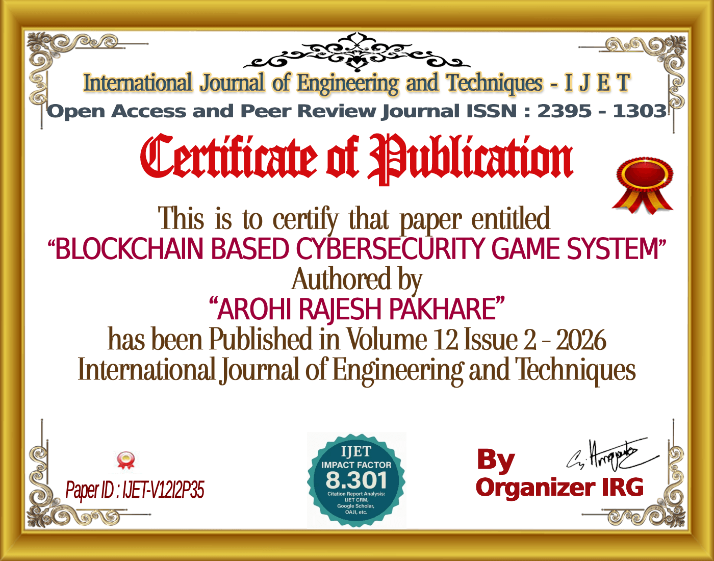 AROHI RAJESH PAKHARE, AKSHATA JEEVAN DANDE, SUBODH CHAURASIA, MS.R.G.CHORGHE, Ms.Z..S.Sajjade, “BLOCKCHAIN BASED CYBERSECURITY GAME SYSTEM,” International Journal of Engineering and Techniques (IJET), vol. 12, no. 2, March 2026, doi: {{doi}}.