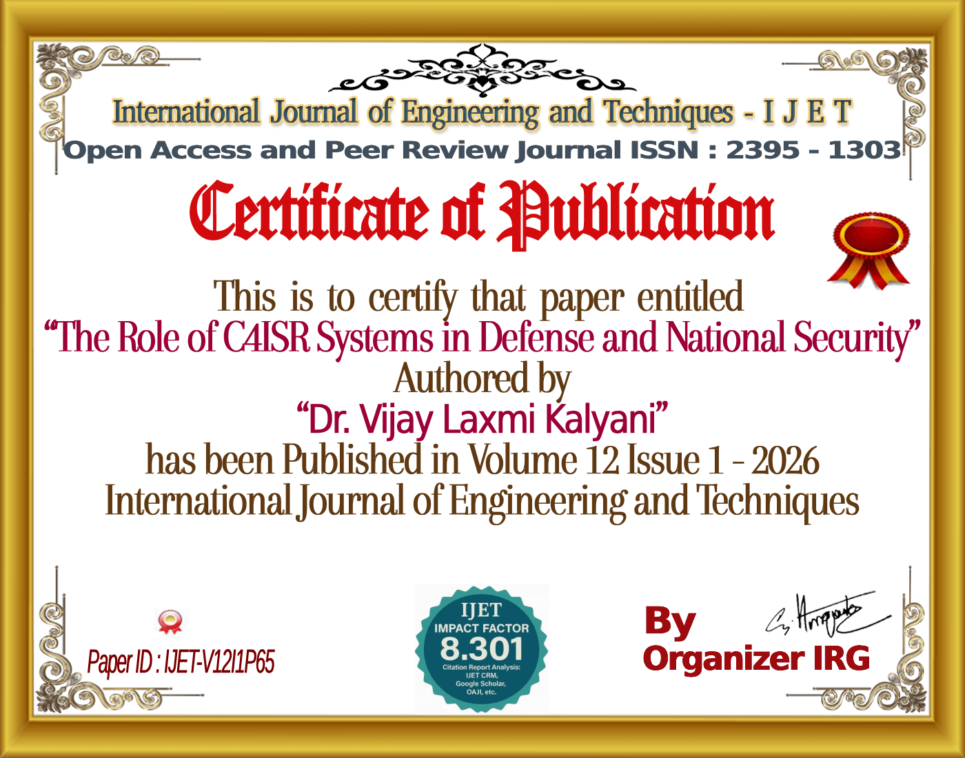 Sameeksha Mehra, Dr. Vijay Laxmi Kalyani, “The Role of C4ISR Systems in Defense and National Security,” International Journal of Engineering and Techniques (IJET), vol. 12, no. 1, February 2026, doi: {{doi}}.