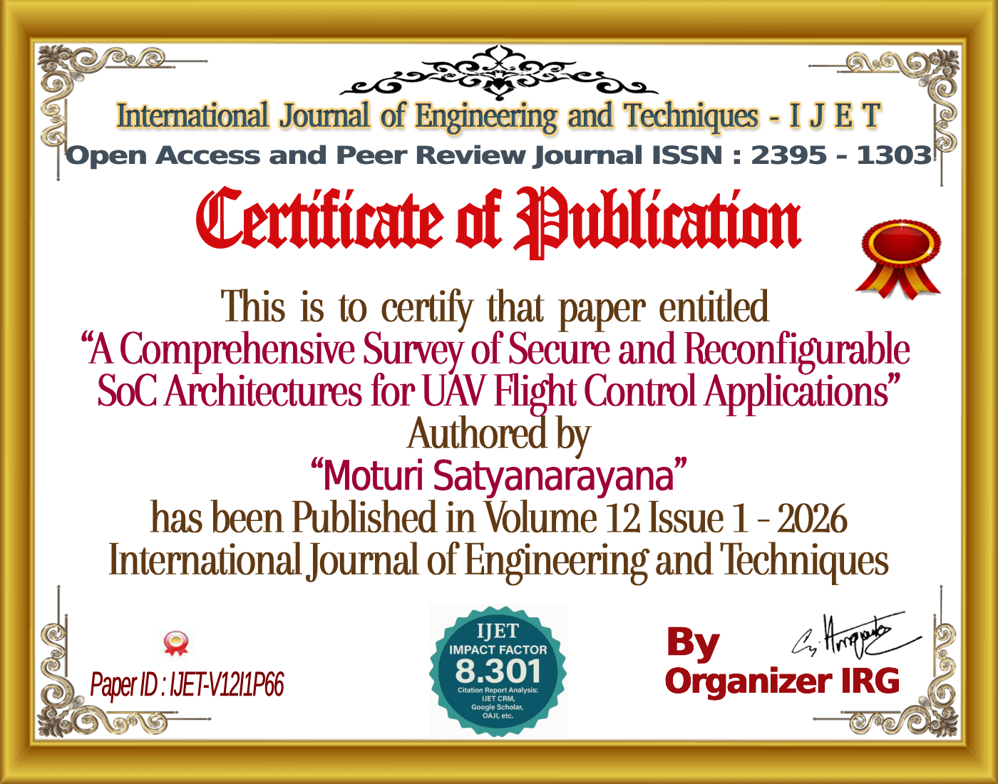 Kalakurasa Rakesh, Moturi Satyanarayana, “A Comprehensive Survey of Secure and Reconfigurable SoC Architectures for UAV Flight Control Applications,” International Journal of Engineering and Techniques (IJET), vol. 12, no. 1, February 2026, doi: {{doi}}.