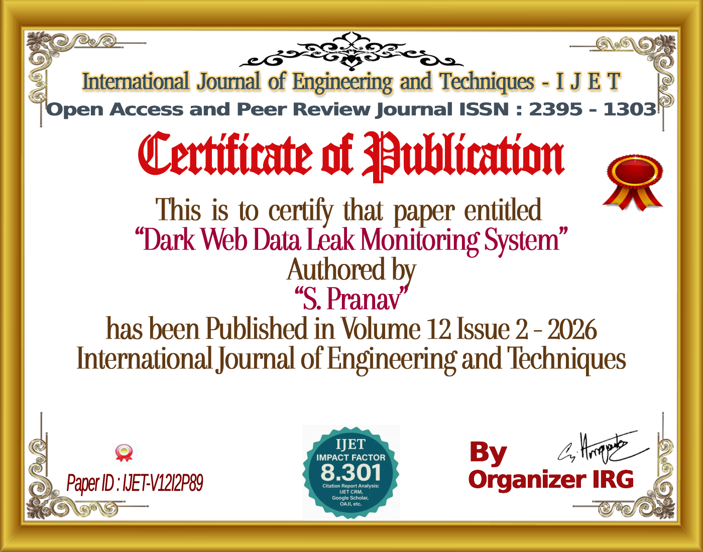 Dark Web Data Leak Monitoring System | IJET – Volume 12 Issue 2 | IJET-V12I2P89