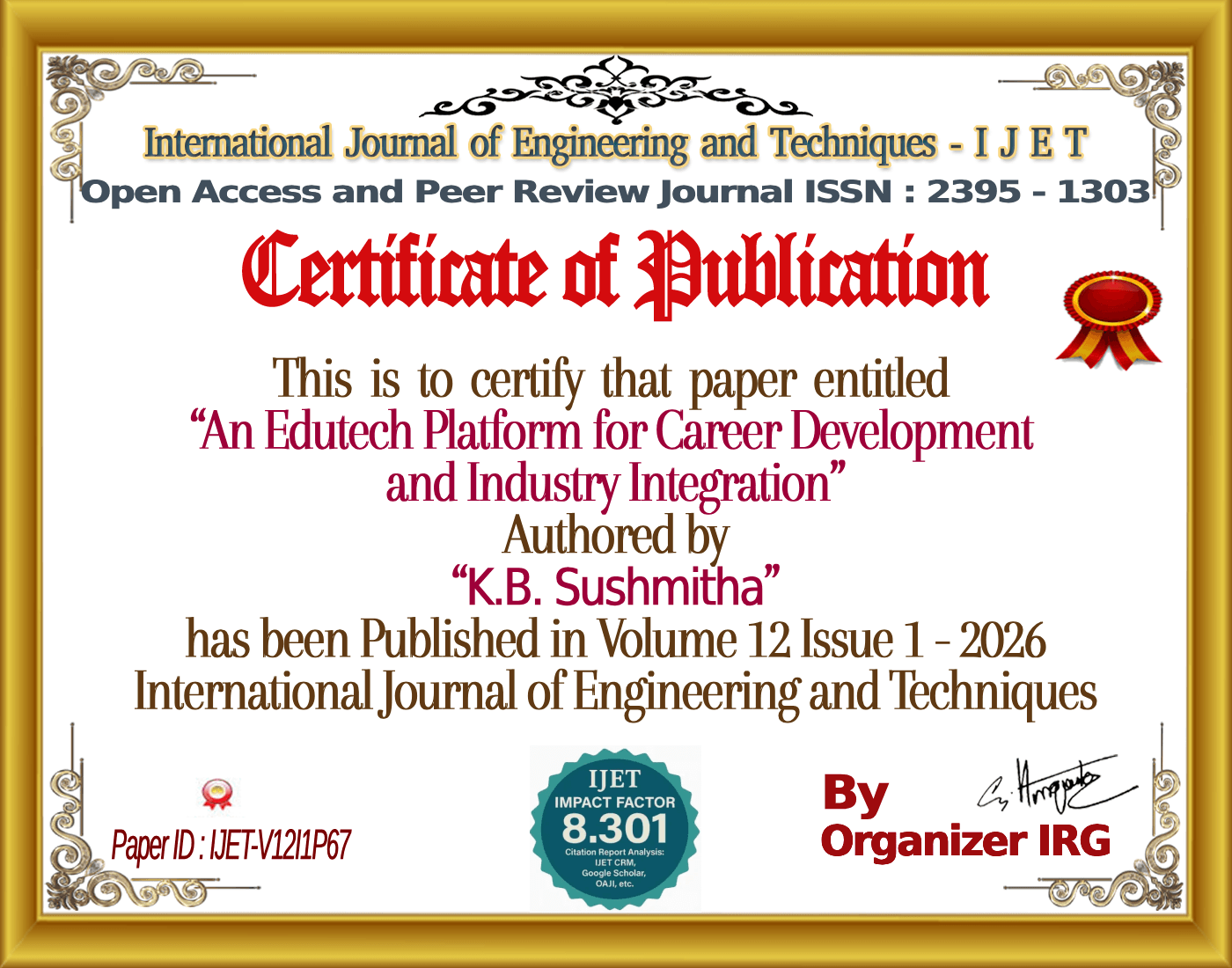 E.Thangadurai, K.B. Sushmitha (February 2026). An Edutech Platform for Career Development and Industry Integration. International Journal of Engineering and Techniques (IJET), 12(1). https://doi.org/{{doi}}