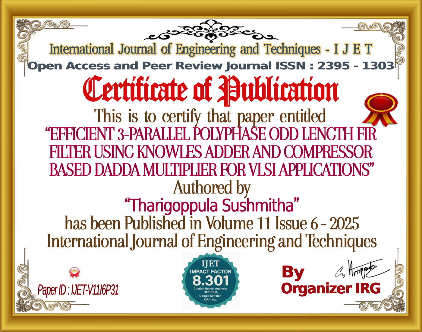 Tharigoppula Sushmitha, DR.T. Madhavi Kumari, “EFFICIENT 3-PARALLEL POLYPHASE ODD LENGTH FIR FILTER USING KNOWLES ADDER AND COMPRESSOR BASED DADDA MULTIPLIER FOR VLSI APPLICATIONS,” International Journal of Engineering and Techniques (IJET), vol. 11, no. 6, December 2025, doi: {{doi}}.