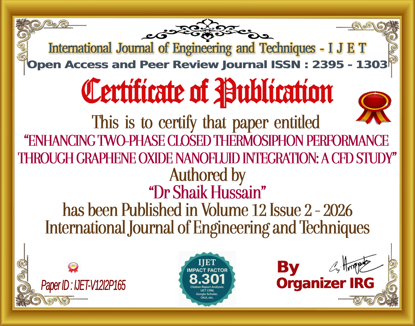 Bondla Rekha, Dr Shaik Hussain, “ENHANCING TWO-PHASE CLOSED THERMOSIPHON PERFORMANCE THROUGH GRAPHENE OXIDE NANOFLUID INTEGRATION: A CFD STUDY,” International Journal of Engineering and Techniques (IJET), vol. 12, no. 2, April 2026, doi: {{doi}}.