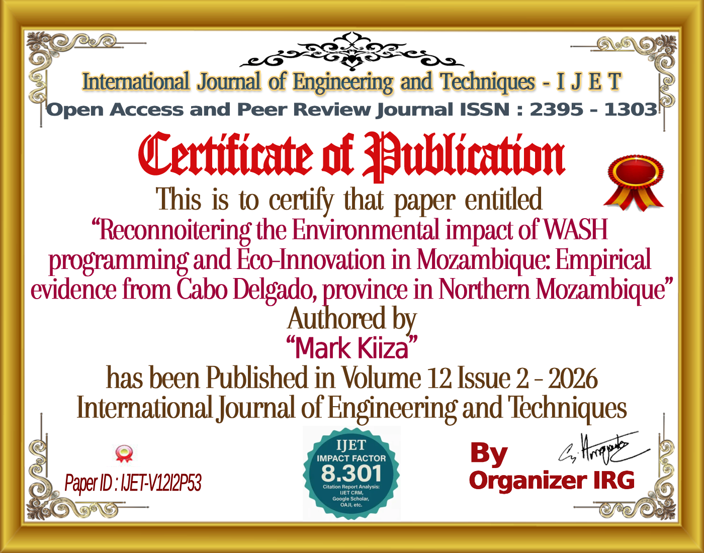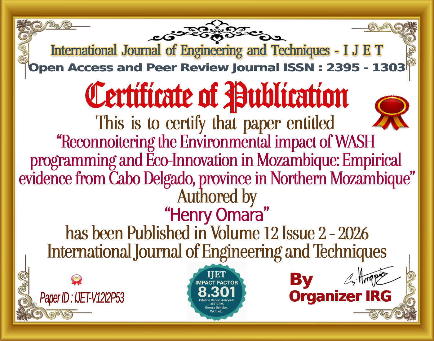 Henry Omara, Mark Kiiza, âReconnoitering the Environmental impact of WASH programming and Eco-Innovation in Mozambique: Empirical evidence from Cabo Delgado, province in Northern Mozambique,â International Journal of Engineering and Techniques (IJET), vol. 12, no. 2, April 2026, doi: {{doi}}.