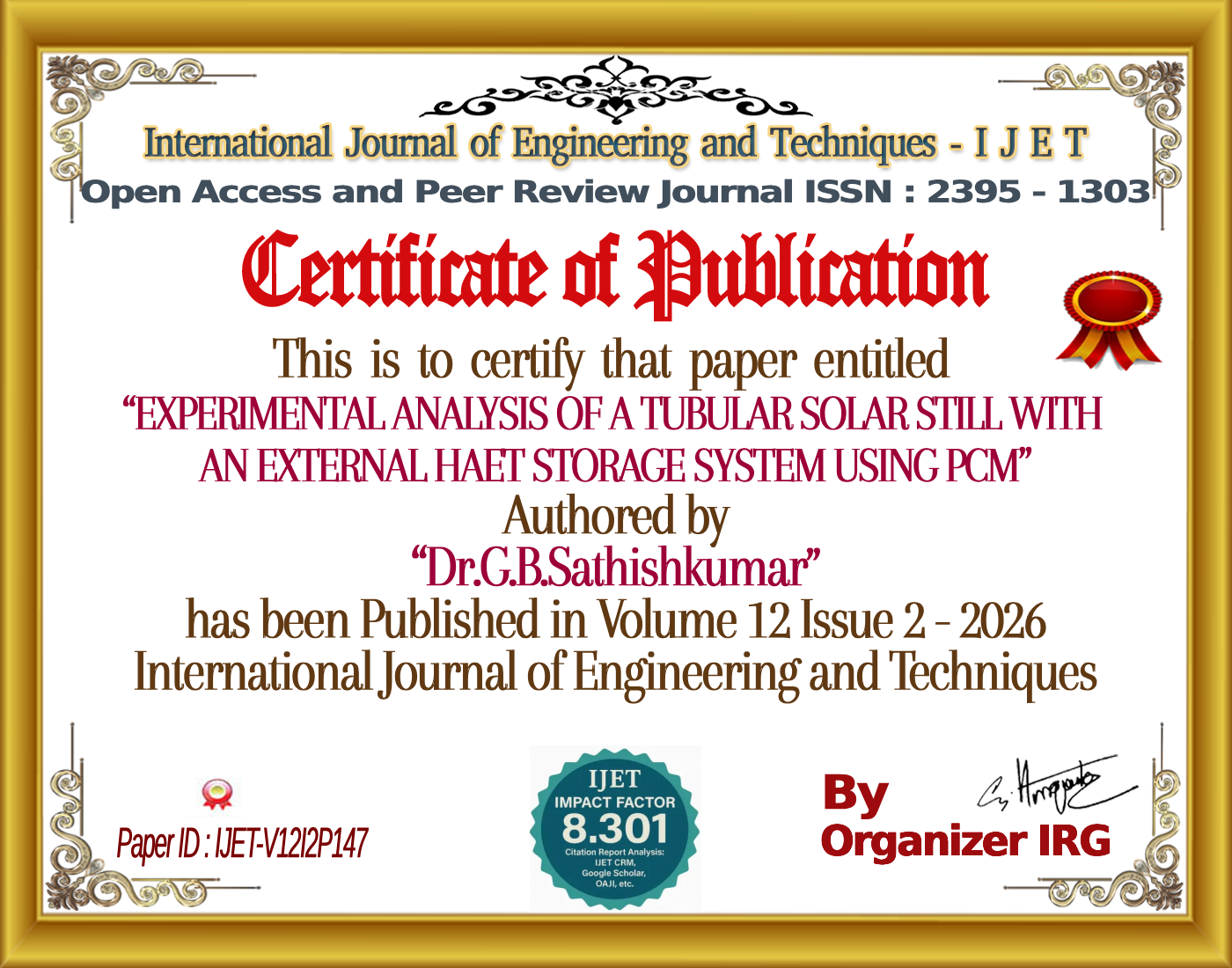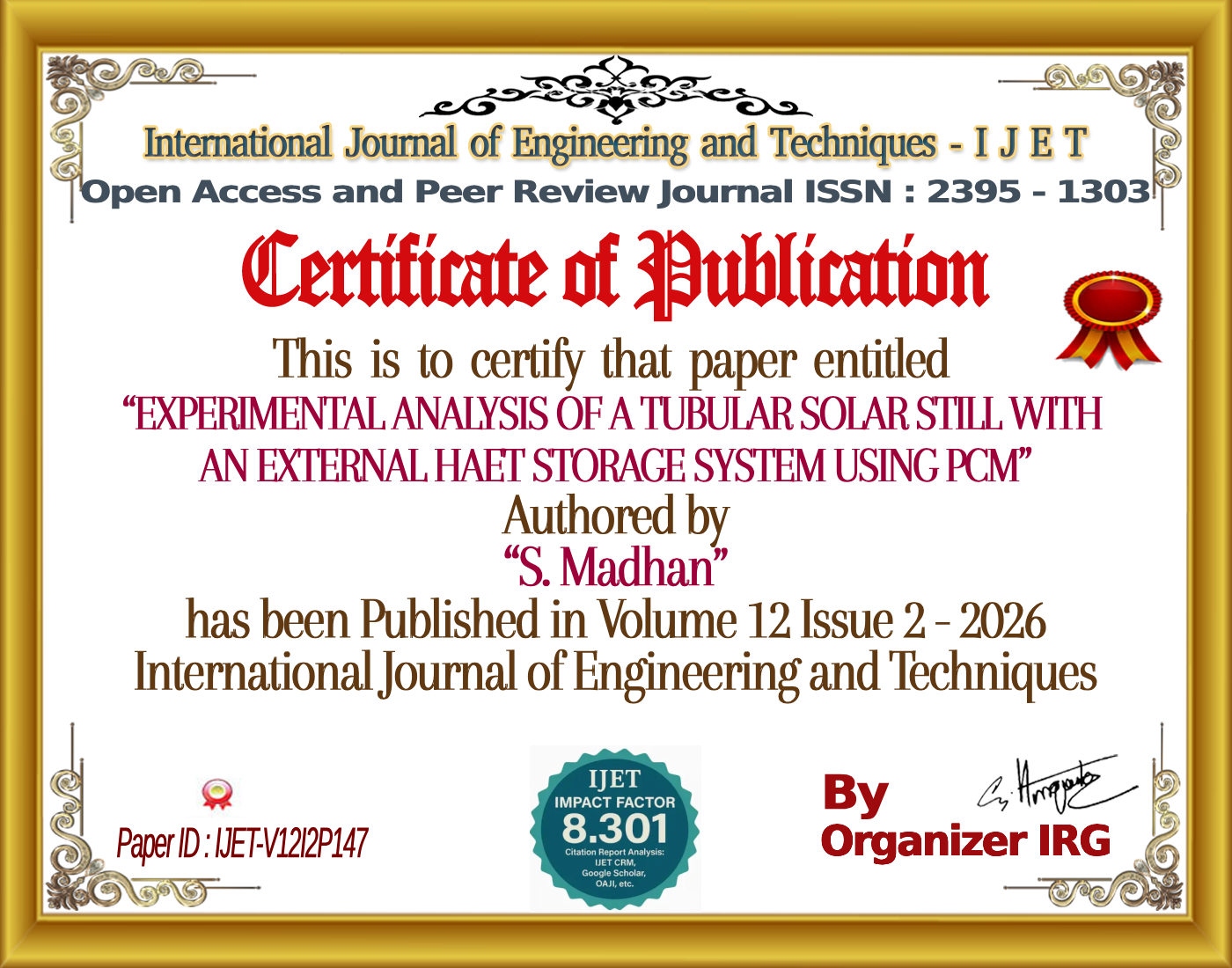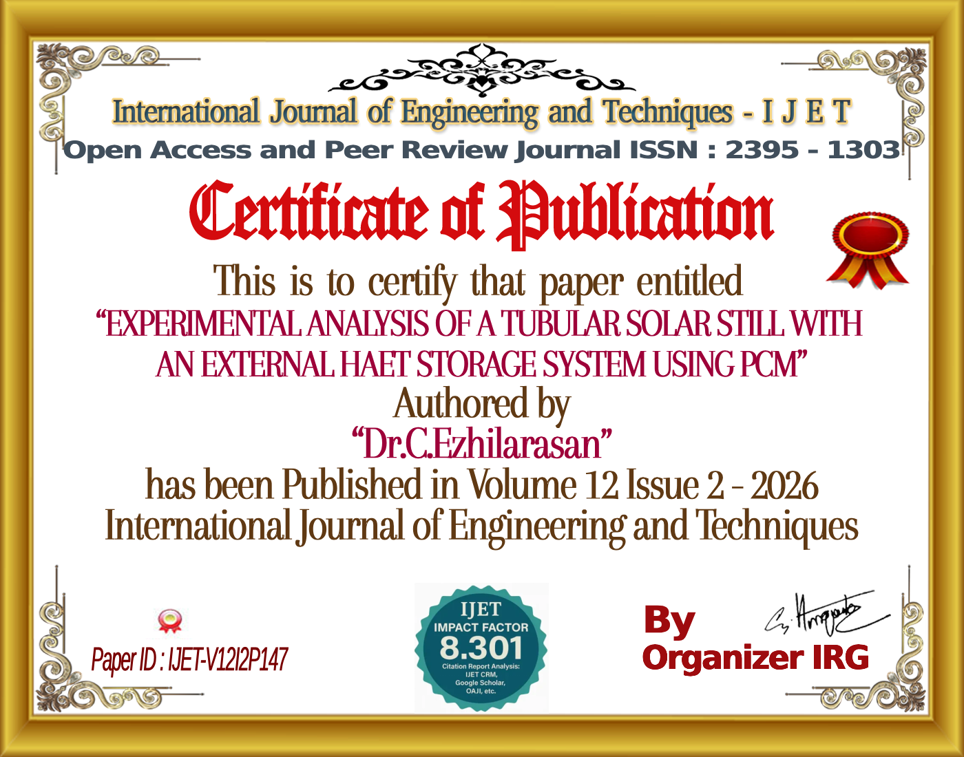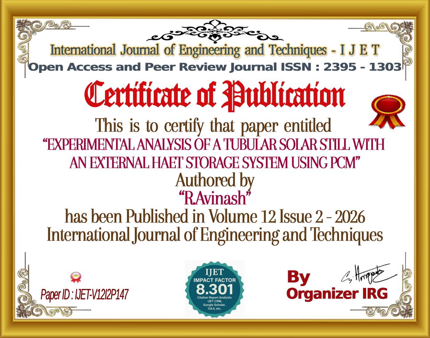 EXPERIMENTALÂ ANALYSISÂ OFÂ AÂ TUBULARÂ SOLAR STILL WITH AN EXTERNAL HAET STORAGE SYSTEM USING PCM | IJET â Volume 12 Issue 2 | IJET-V12I2P147