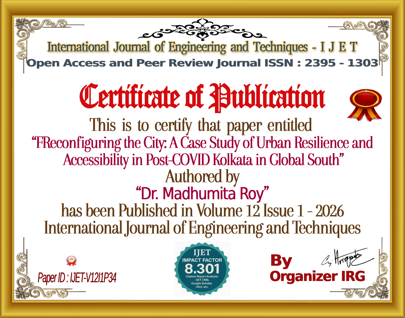 Soumyadeep Dutta, Dr. Madhumita Roy (February 2026). FReconfiguring the City: A Case Study of Urban Resilience and Accessibility in Post-COVID Kolkata in Global South. International Journal of Engineering and Techniques (IJET), 12(1). https://zenodo.org/records/18600292
