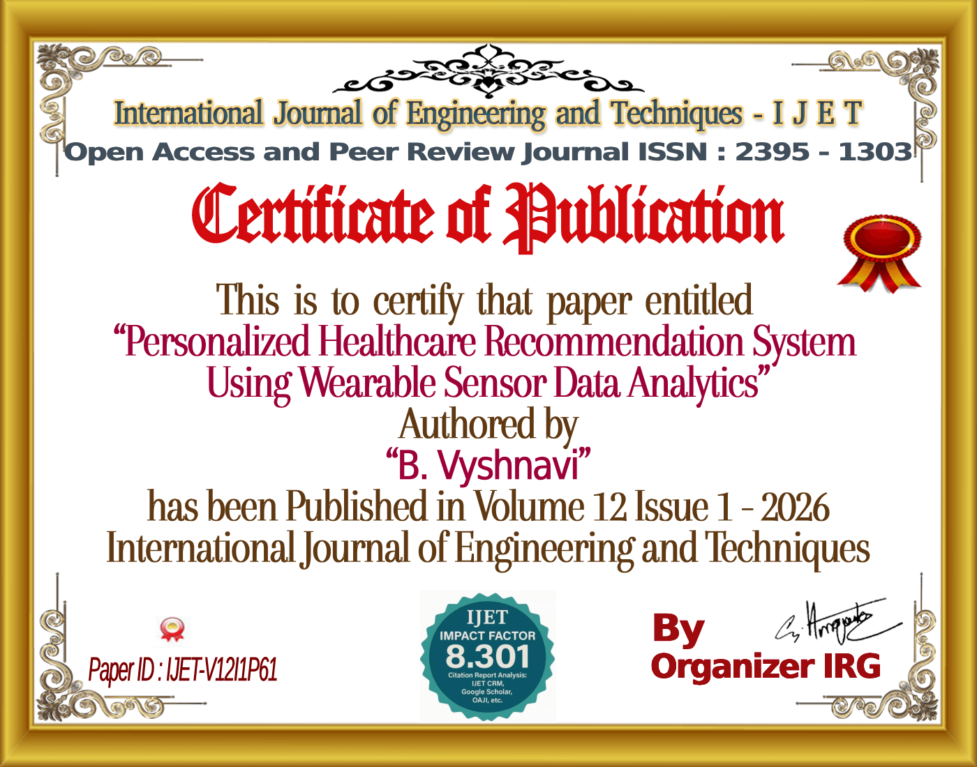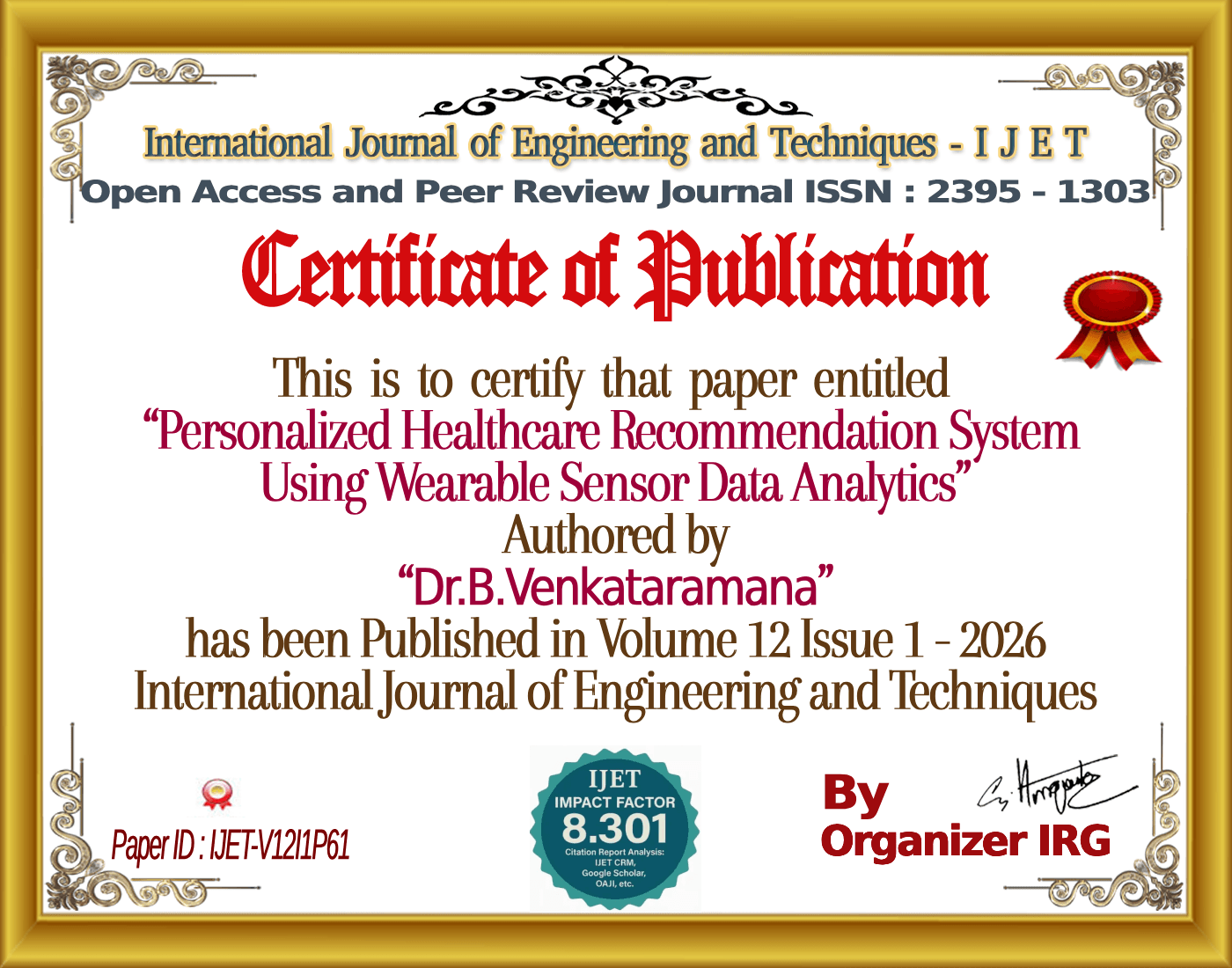G.Apoorva, G. Vaishnavi, B. Vyshnavi, A. Aravind, Dr. S. Srinivas,Dr.B.Venkataramana, “Personalized Healthcare Recommendation System Using Wearable Sensor Data Analytics,” International Journal of Engineering and Techniques (IJET), vol. 12, no. 1, February 2026, doi: {{doi}}.