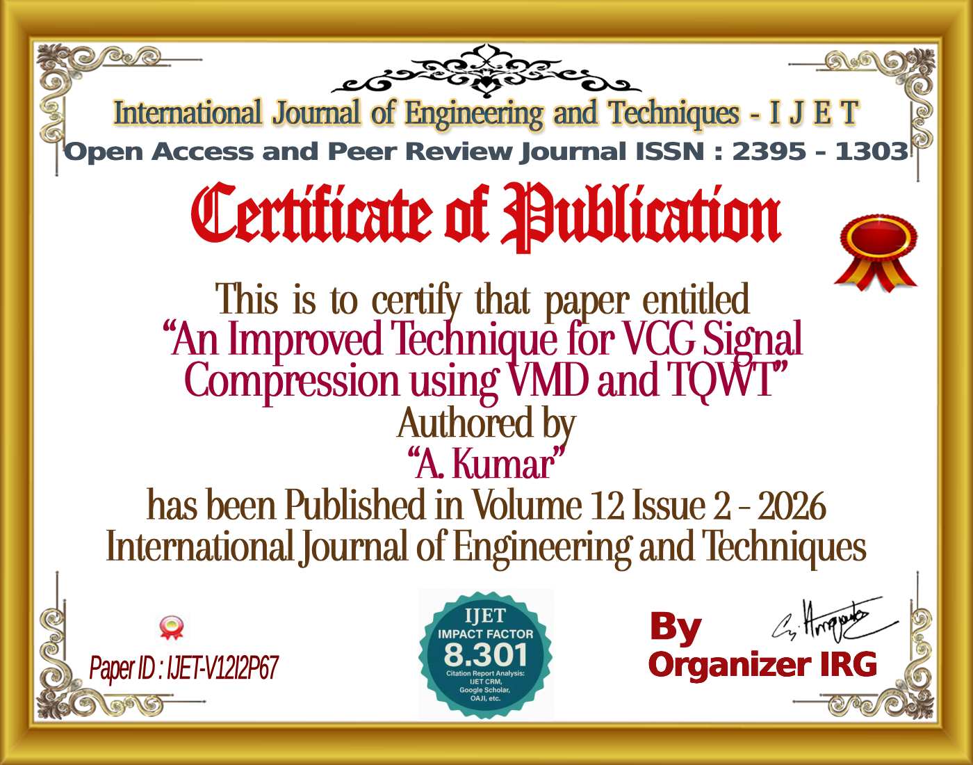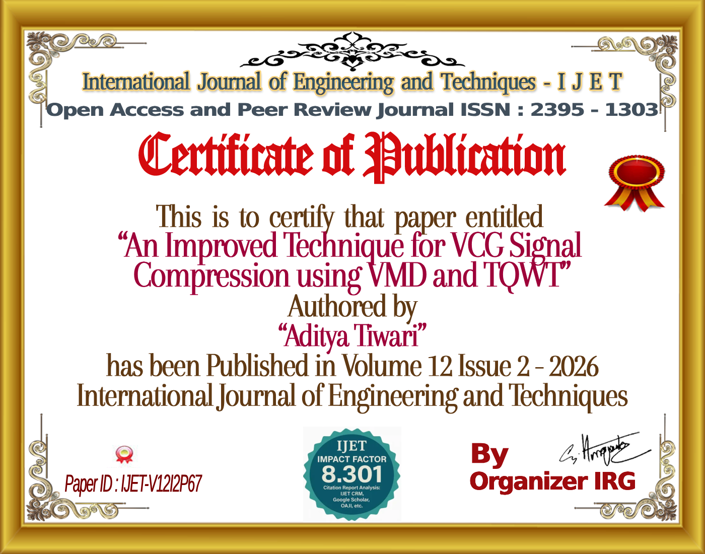 H. Gupta, Aditya Tiwari, A. Kumar (April 2026). An Improved Technique for VCG Signal Compression using VMD and TQWT. International Journal of Engineering and Techniques (IJET), 12(2). https://doi.org/{{doi}}