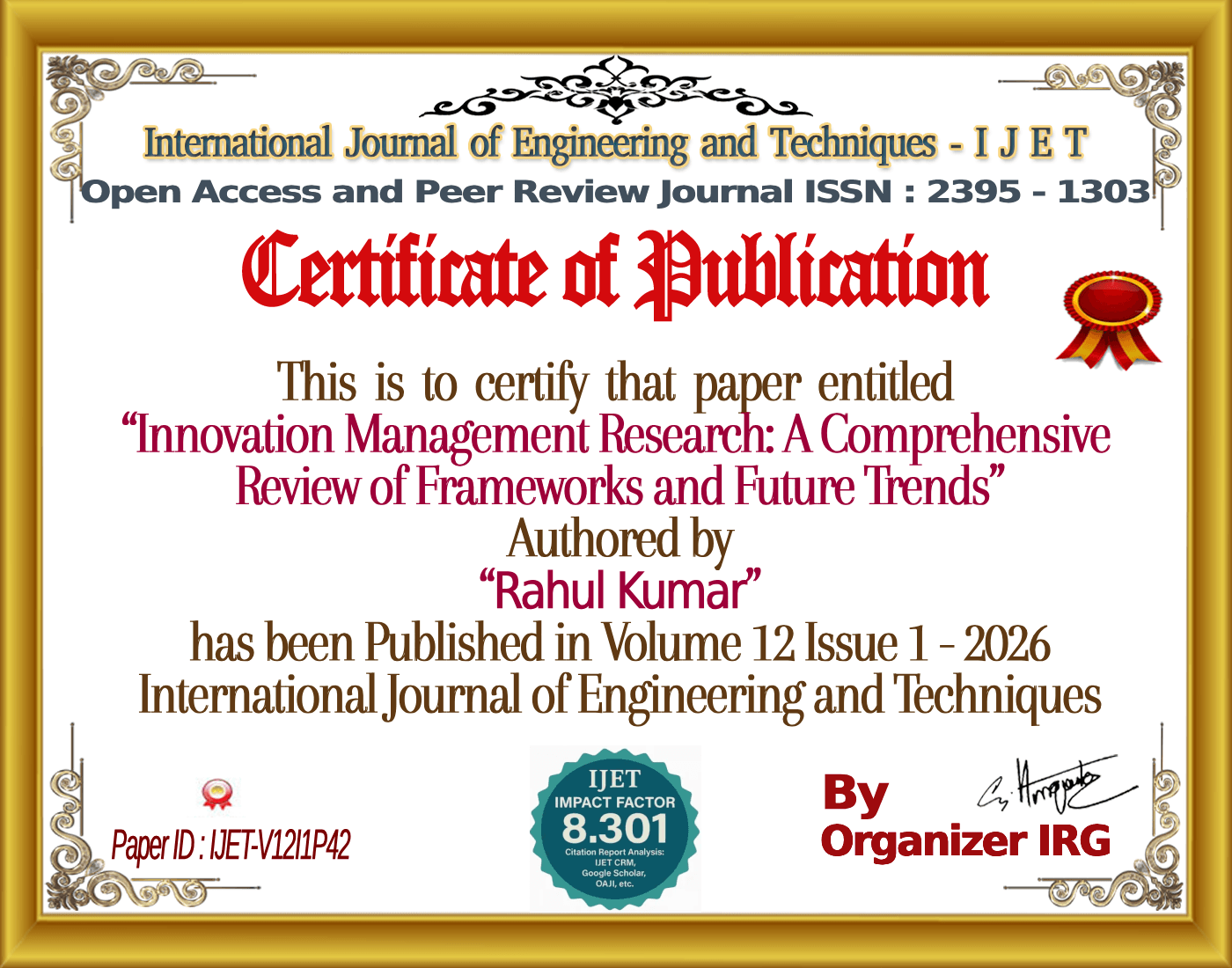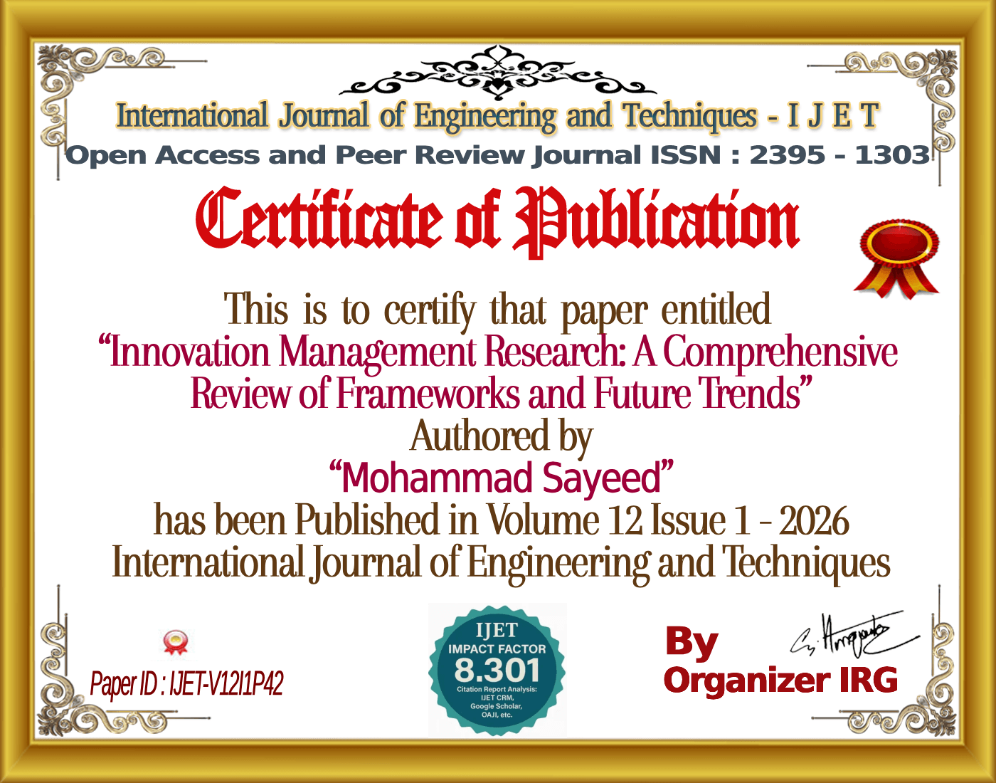 Mohammad Sayeed, Rahul Kumar, Abhishek Chaukiyal (February 2026). Innovation Management Research: A Comprehensive Review of Frameworks and Future Trends. International Journal of Engineering and Techniques (IJET), 12(1). https://zenodo.org/records/18684400