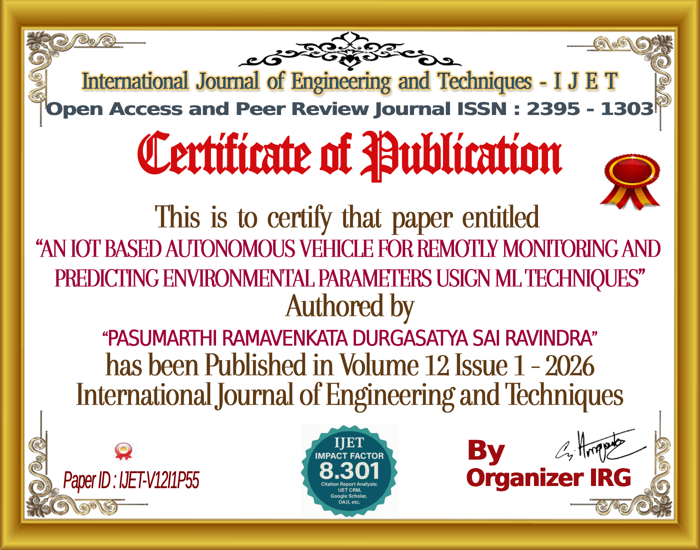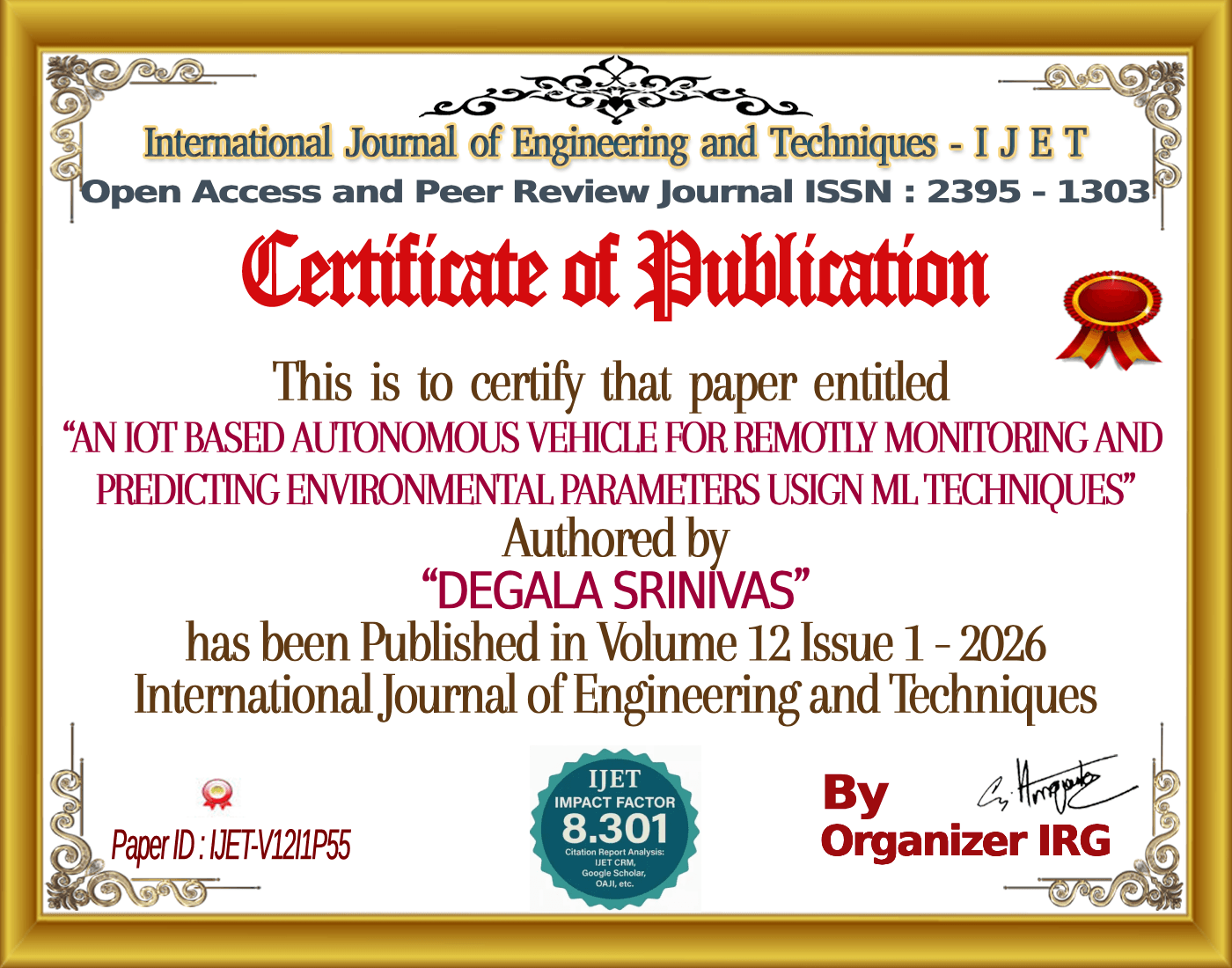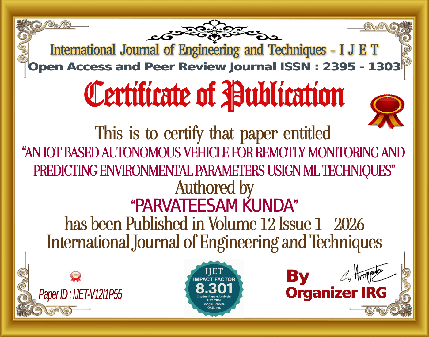 AN IOT BASED AUTONOMOUS VEHICLE FOR REMOTLY MONITORING AND PREDICTING ENVIRONMENTAL PARAMETERS USIGN ML TECHNIQUES | IJET – Volume 12 Issue 1 | IJET-V12I1P55