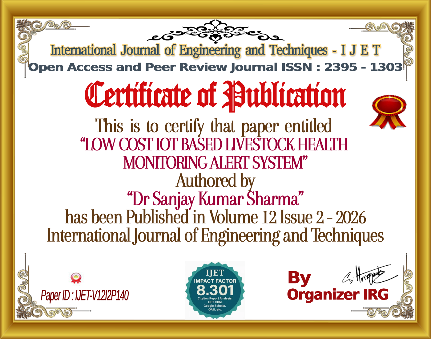 LOW COST IOT BASED LIVESTOCK HEALTH MONITORING ALERT SYSTEM | IJET – Volume 12 Issue 2 | IJET-V12I2P140