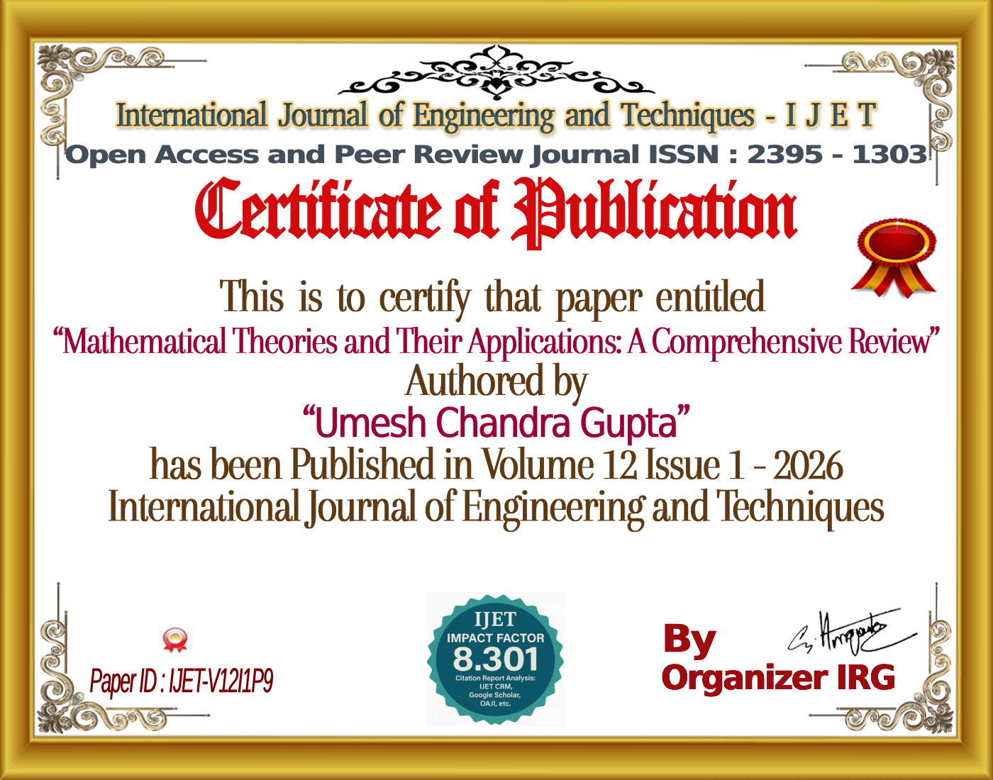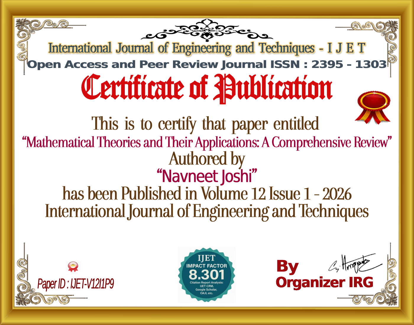 Umesh Chandra Gupta, Navneet Joshi, Mohammad Sayeed, “Mathematical Theories and Their Applications: A Comprehensive Review,” International Journal of Engineering and Techniques (IJET), vol. 12, no. 1, January 2026, doi: {{doi}}.