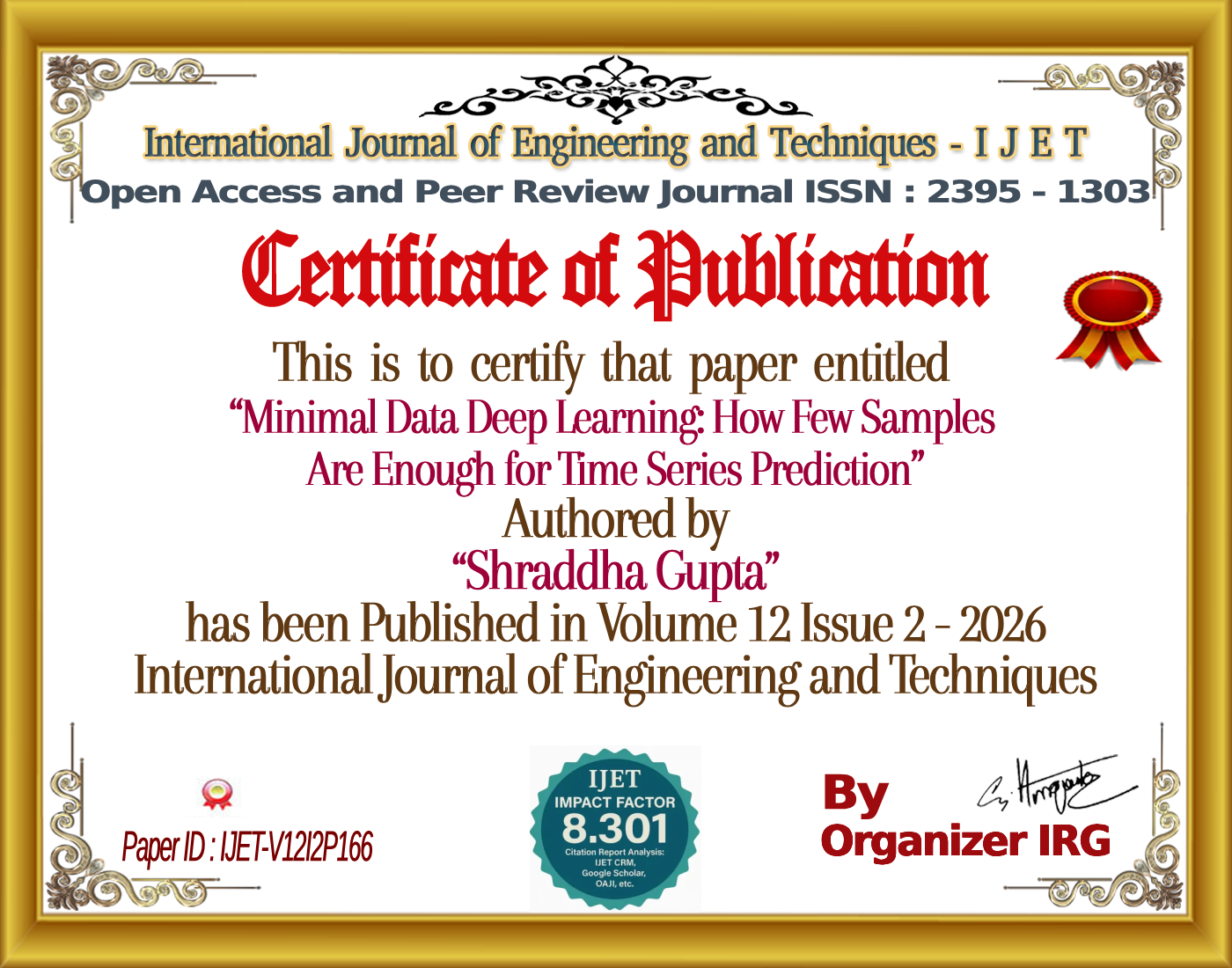 Shraddha Gupta, β€œMinimal Data Deep Learning: How Few Samples Are Enough for Time Series Prediction,” International Journal of Engineering and Techniques (IJET), vol. 12, no. 2, April 2026, doi: {{doi}}.