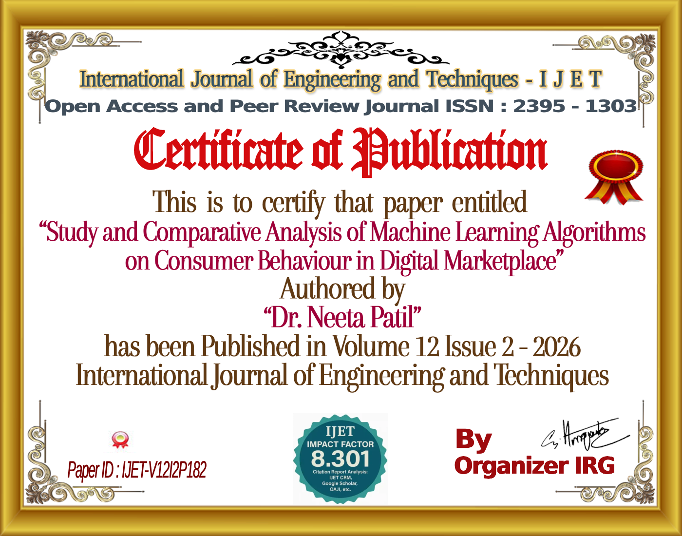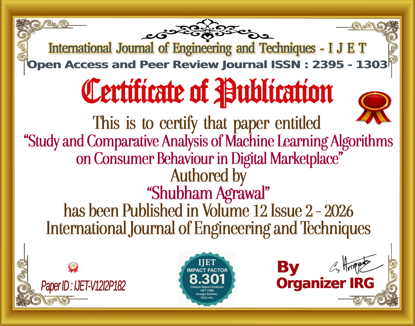 Shubham Agrawal, Dr. Neeta Patil, Dr. Rajesh Bansode, “Study and Comparative Analysis of Machine Learning Algorithms on Consumer Behaviour in Digital Marketplace,” International Journal of Engineering and Techniques (IJET), vol. 12, no. 2, April 2026, doi: {{doi}}.