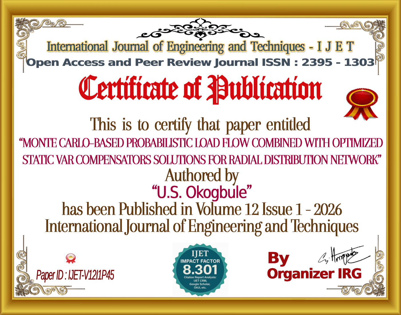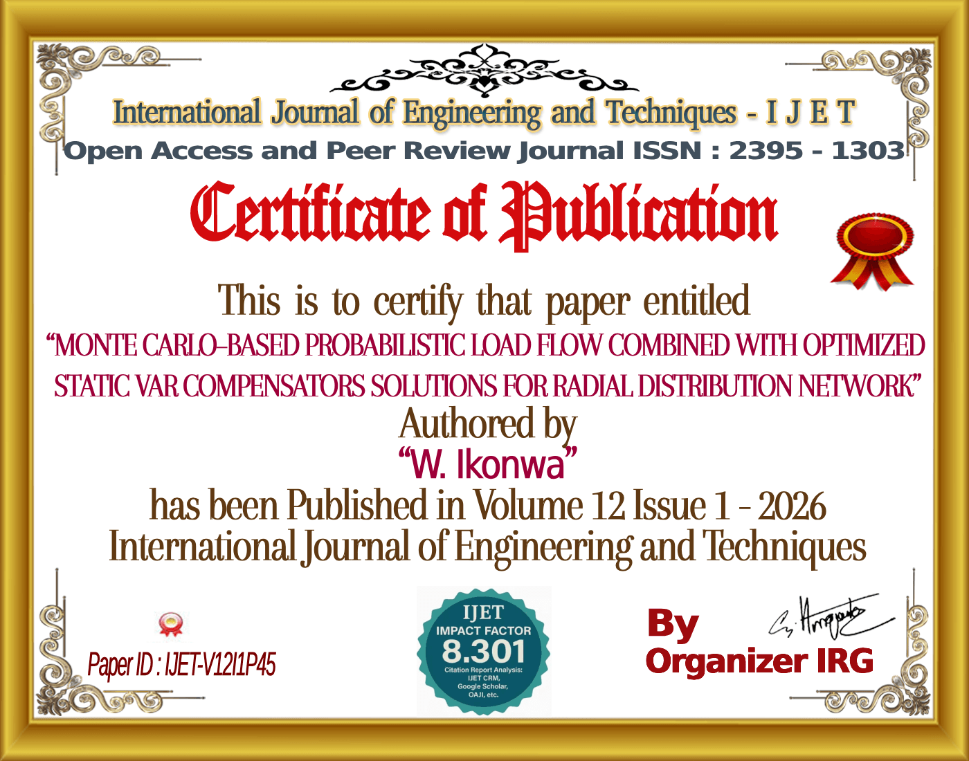 W. Ikonwa, U.S. Okogbule, “MONTE CARLO–BASED PROBABILISTIC LOAD FLOW COMBINED WITH OPTIMIZED STATIC VAR COMPENSATORS SOLUTIONS FOR RADIAL DISTRIBUTION NETWORK,” International Journal of Engineering and Techniques (IJET), vol. 12, no. 1, February 2026, doi: https://zenodo.org/records/18696870.