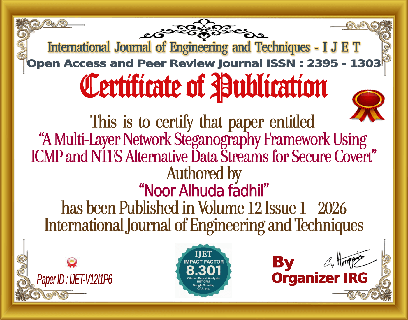 Salam Ghanim Najeeb, Noor Alhuda fadhil, âA Multi-Layer Network Steganography Framework Using ICMP and NTFS Alternative Data Streams for Secure Covert,â International Journal of Engineering and Techniques (IJET), vol. 12, no. 1, January 2026, doi: {{doi}}.