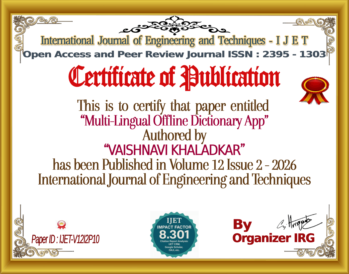 SHREYA PATHARE, VAISHNAVI KHALADKAR, ANUSHKA MHASKE, MS.S.R.SABLE, βMulti-Lingual Offline Dictionary App,β International Journal of Engineering and Techniques (IJET), vol. 12, no. 2, March 2026, doi: {{doi}}.