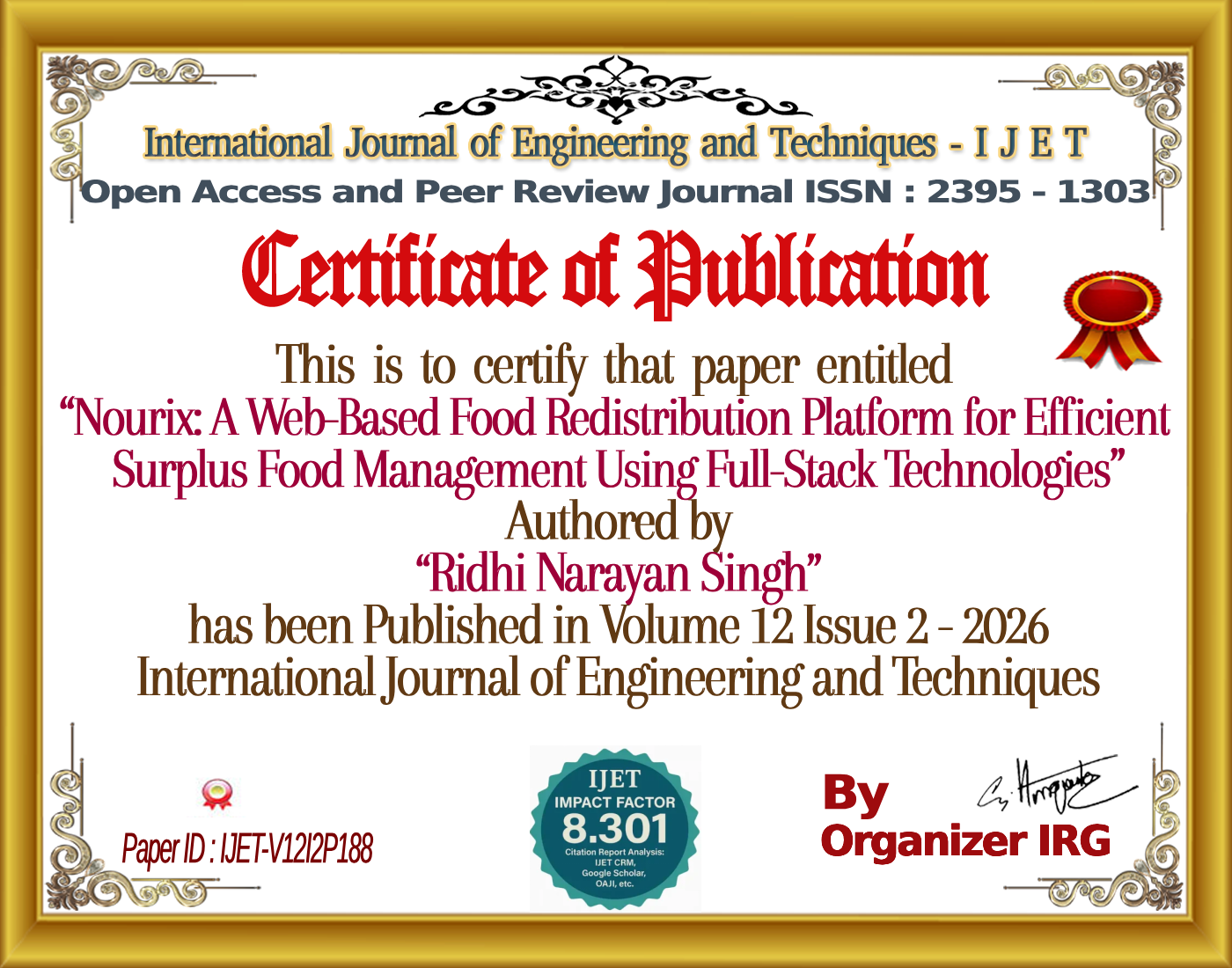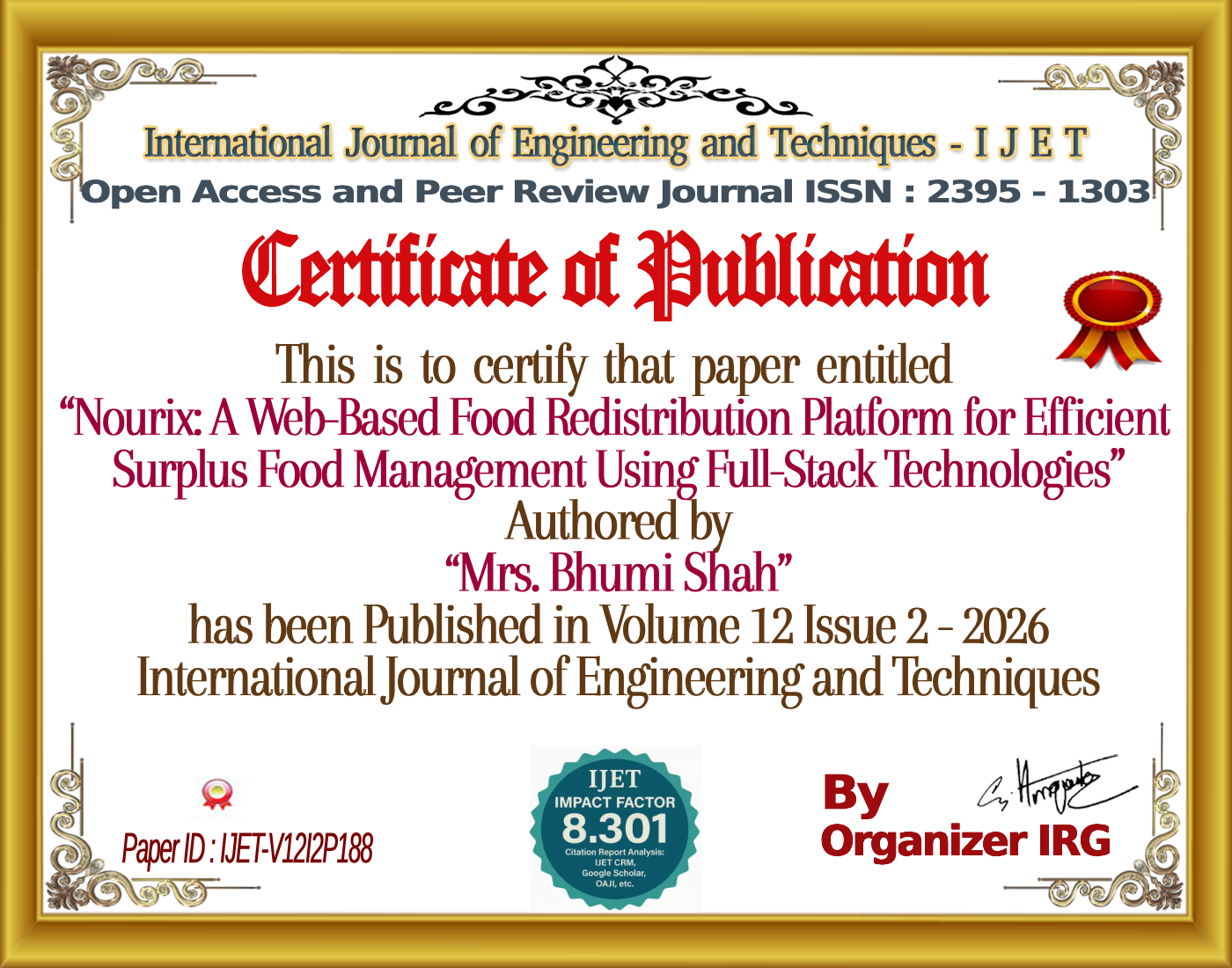 Ridhi Narayan Singh, Mrs. Bhumi Shah, “Nourix: A Web-Based Food Redistribution Platform for Efficient Surplus Food Management Using Full-Stack Technologies,” International Journal of Engineering and Techniques (IJET), vol. 12, no. 2, April 2026, doi: {{doi}}.