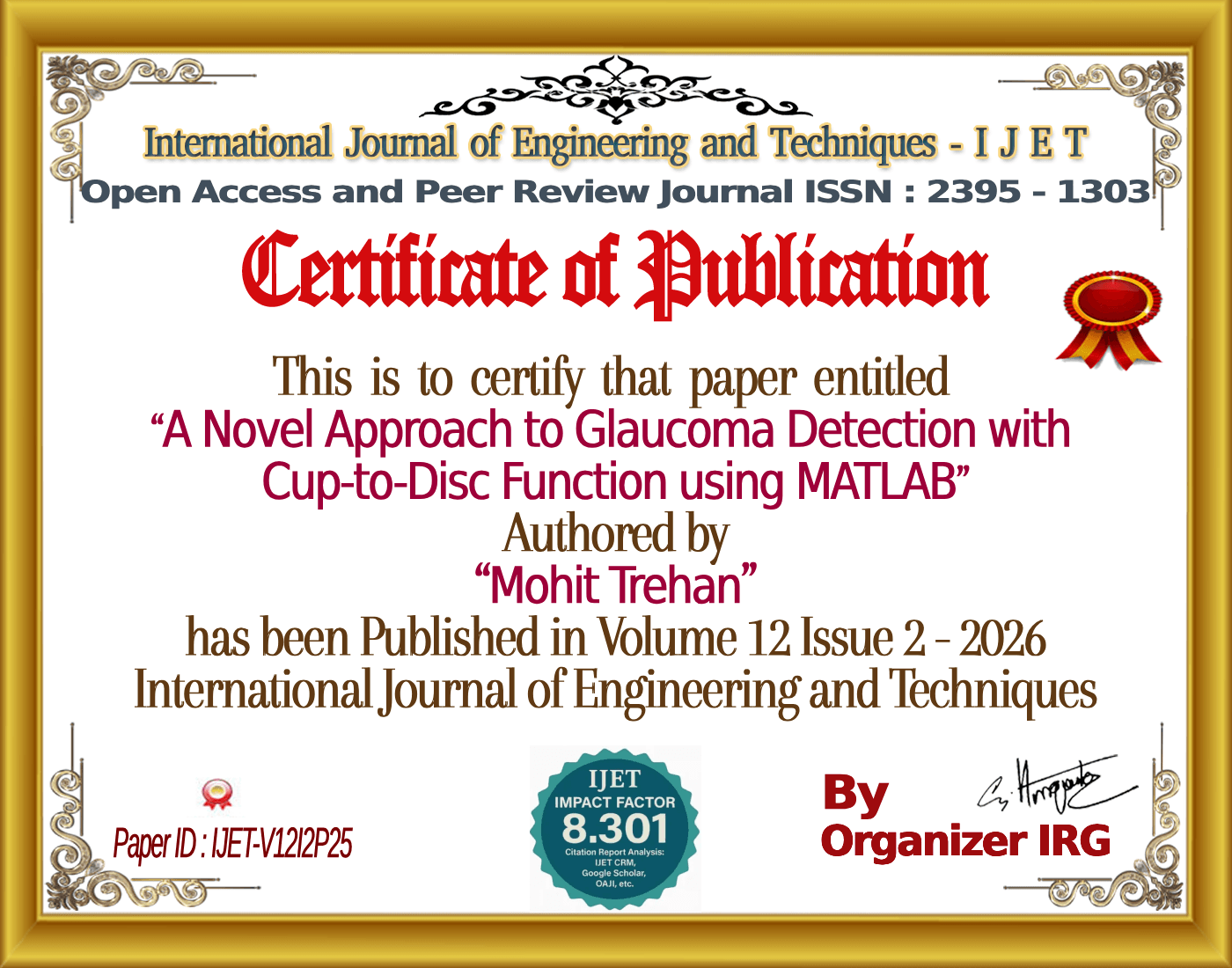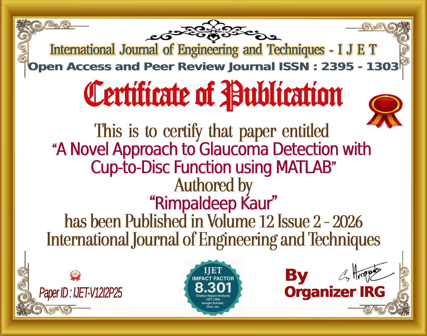 A Novel Approach to Glaucoma Detection with Cup-to-Disc Function using MATLAB | IJET – Volume 12 Issue 2 | IJET-V12I2P25
