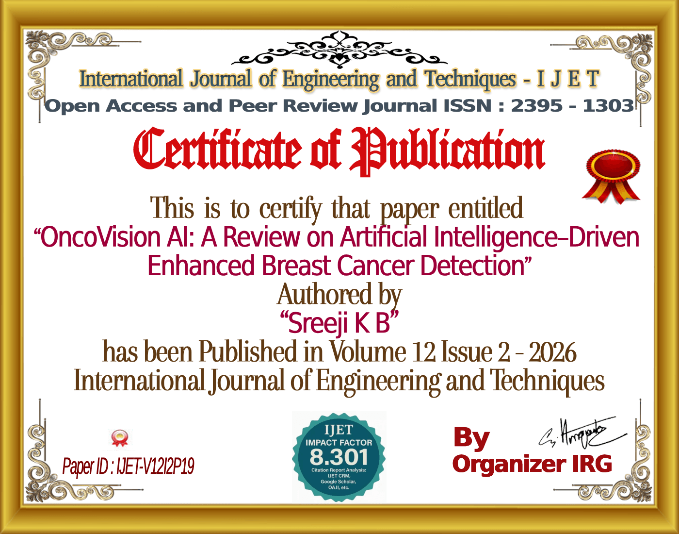 Adhila K S, Sreeji K B, “OncoVision AI: A Review on Artificial Intelligence–Driven Enhanced Breast Cancer Detection,” International Journal of Engineering and Techniques (IJET), vol. 12, no. 2, March 2026, doi: {{doi}}.