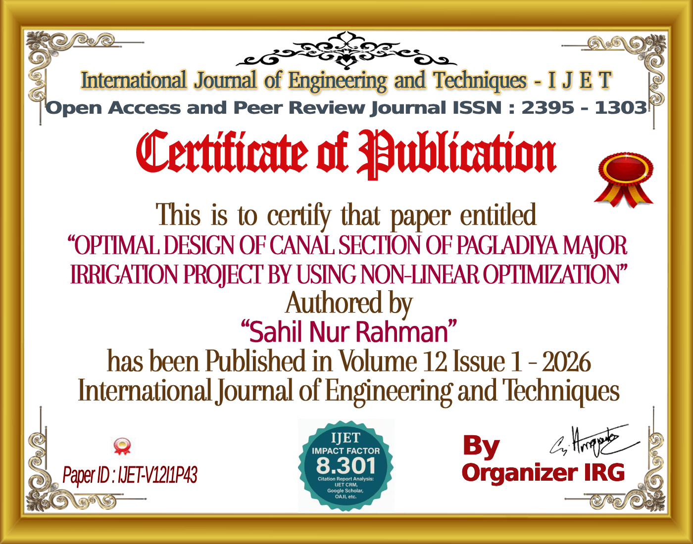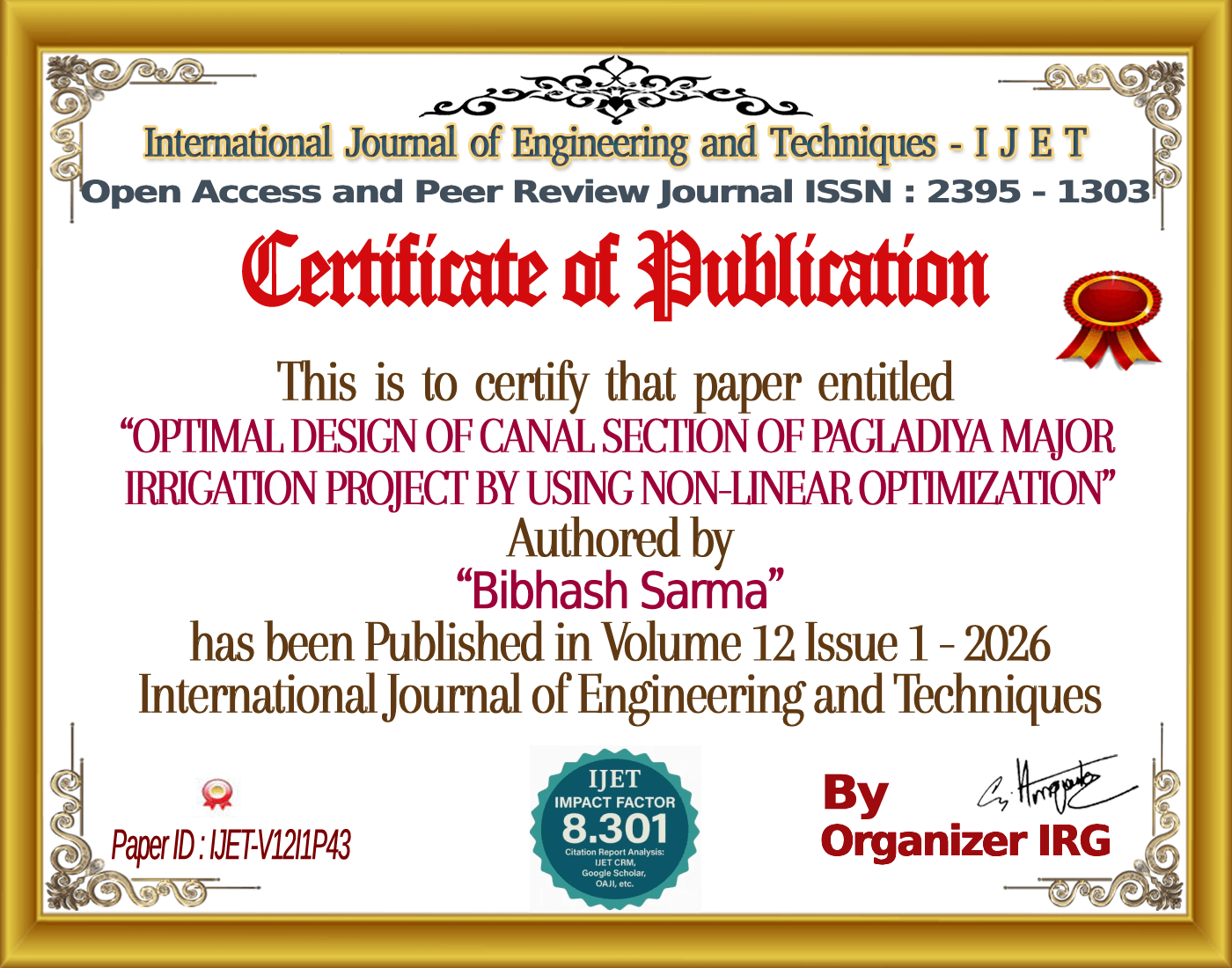 Sahil Nur Rahman, Bibhash Sarma, “OPTIMAL DESIGN OF CANAL SECTION OF PAGLADIYA MAJOR IRRIGATION PROJECT BY USING NON-LINEAR OPTIMIZATION,” International Journal of Engineering and Techniques (IJET), vol. 12, no. 1, February 2026, doi: https://zenodo.org/records/18684613.
