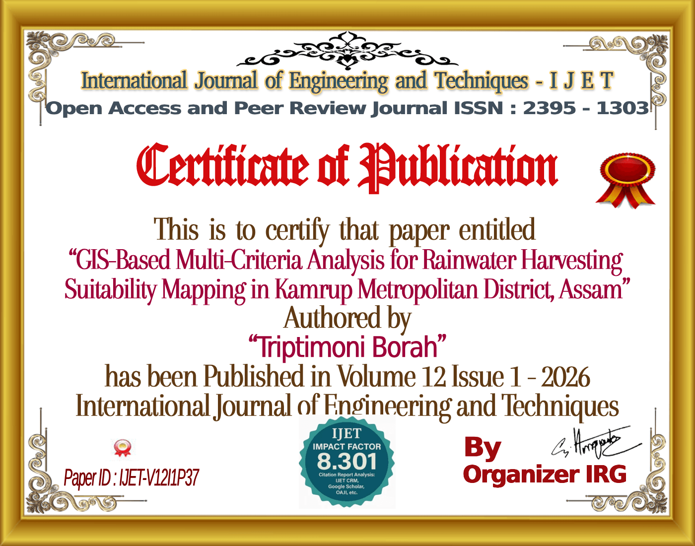 Nilakshi Devi, Triptimoni Borah, “GIS-Based Multi-Criteria Analysis for Rainwater Harvesting Suitability Mapping in Kamrup Metropolitan District, Assam,” International Journal of Engineering and Techniques (IJET), vol. 12, no. 1, February 2026, doi: https://zenodo.org/records/18641474.