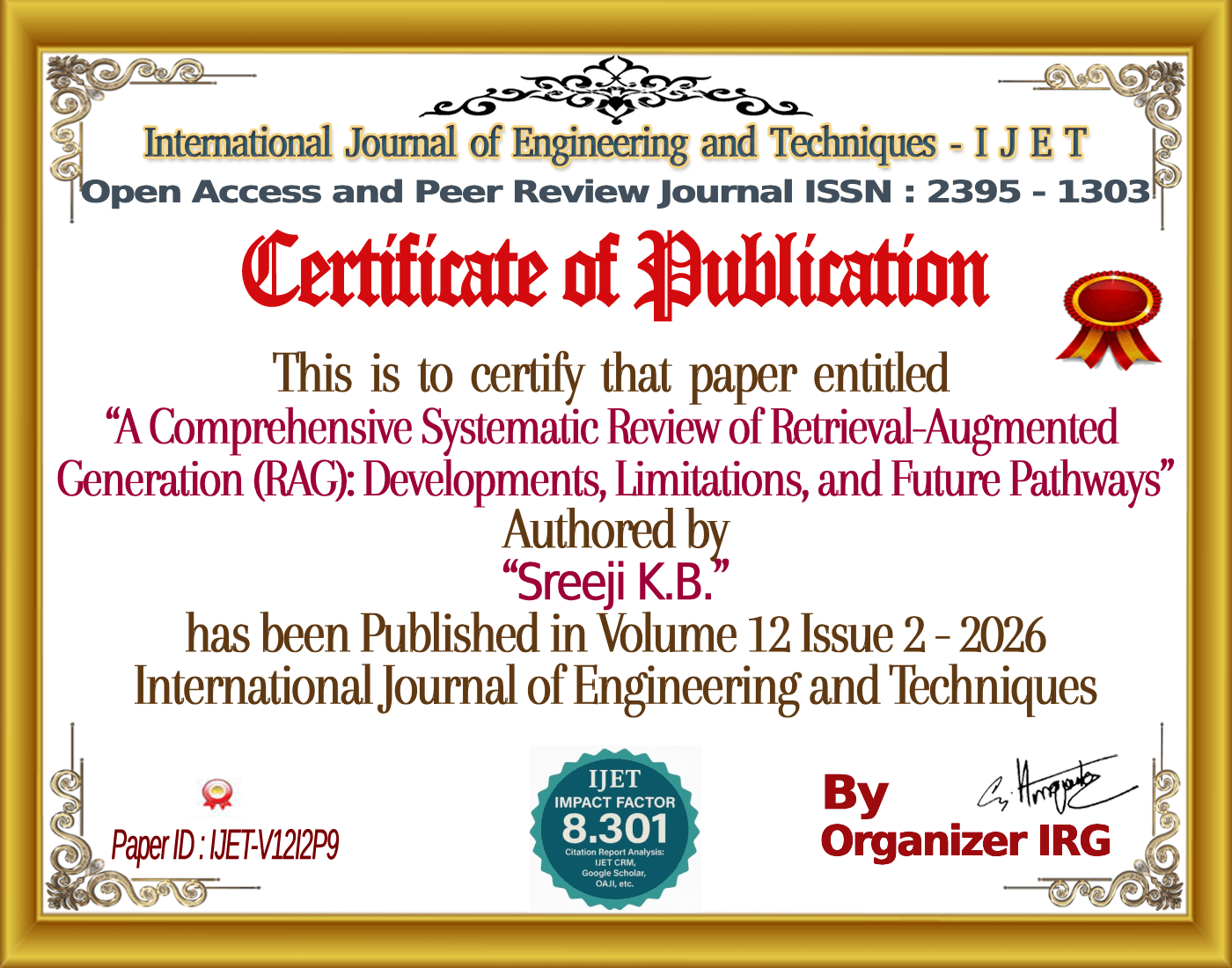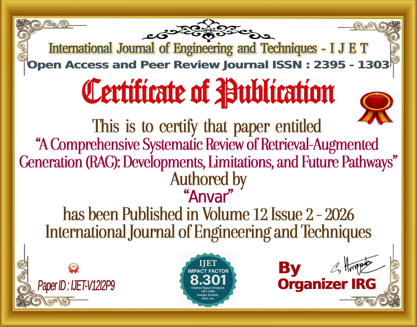 Anvar, Sreeji K.B., âA Comprehensive Systematic Review of Retrieval-Augmented Generation (RAG): Developments, Limitations, and Future Pathways,â International Journal of Engineering and Techniques (IJET), vol. 12, no. 2, March 2026, doi: {{doi}}.