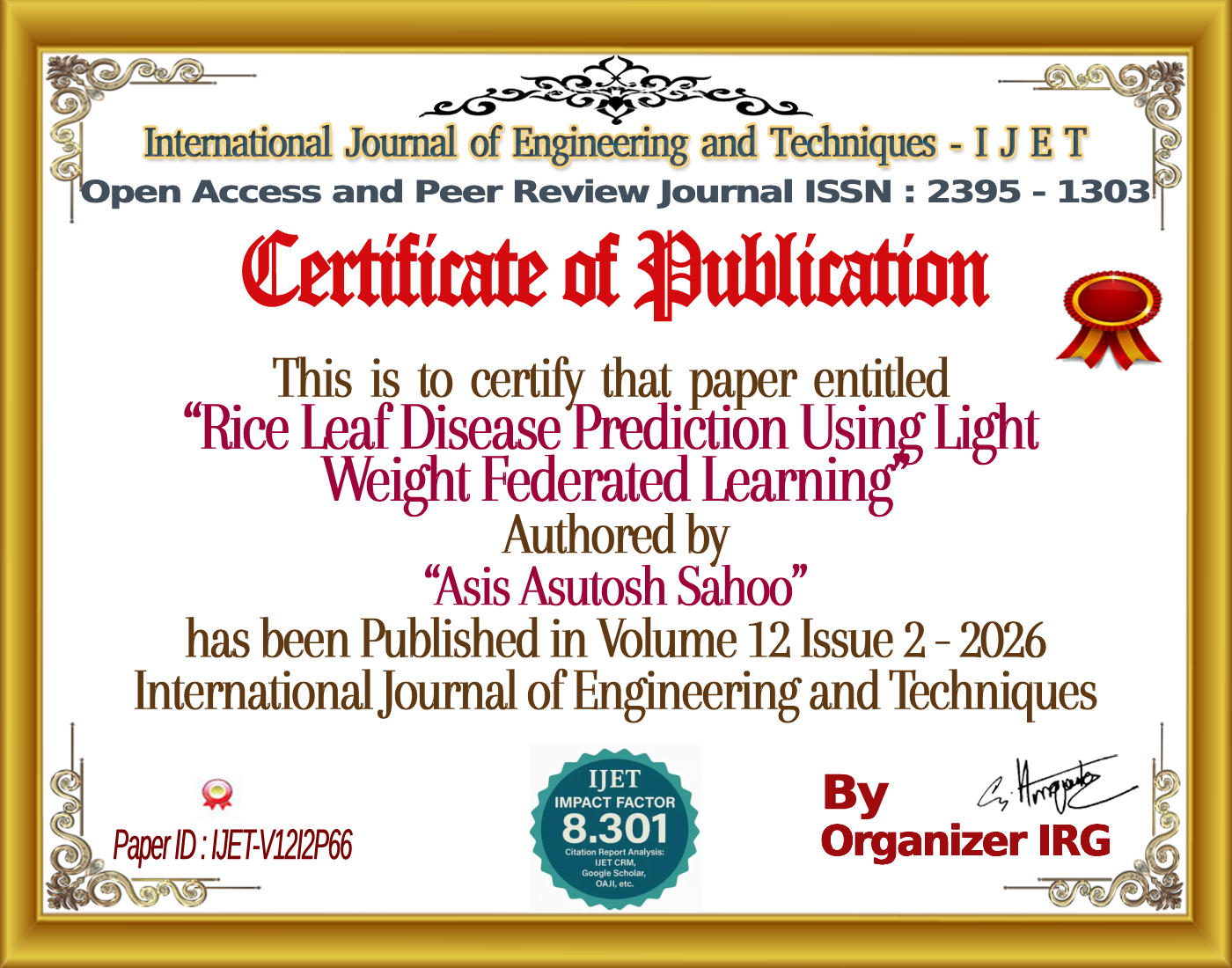 Asis Asutosh Sahoo, T Prachi Patro, Ashish Kumar Dass, “Rice Leaf Disease Prediction Using Light Weight Federated Learning,” International Journal of Engineering and Techniques (IJET), vol. 12, no. 2, April 2026, doi: {{doi}}.