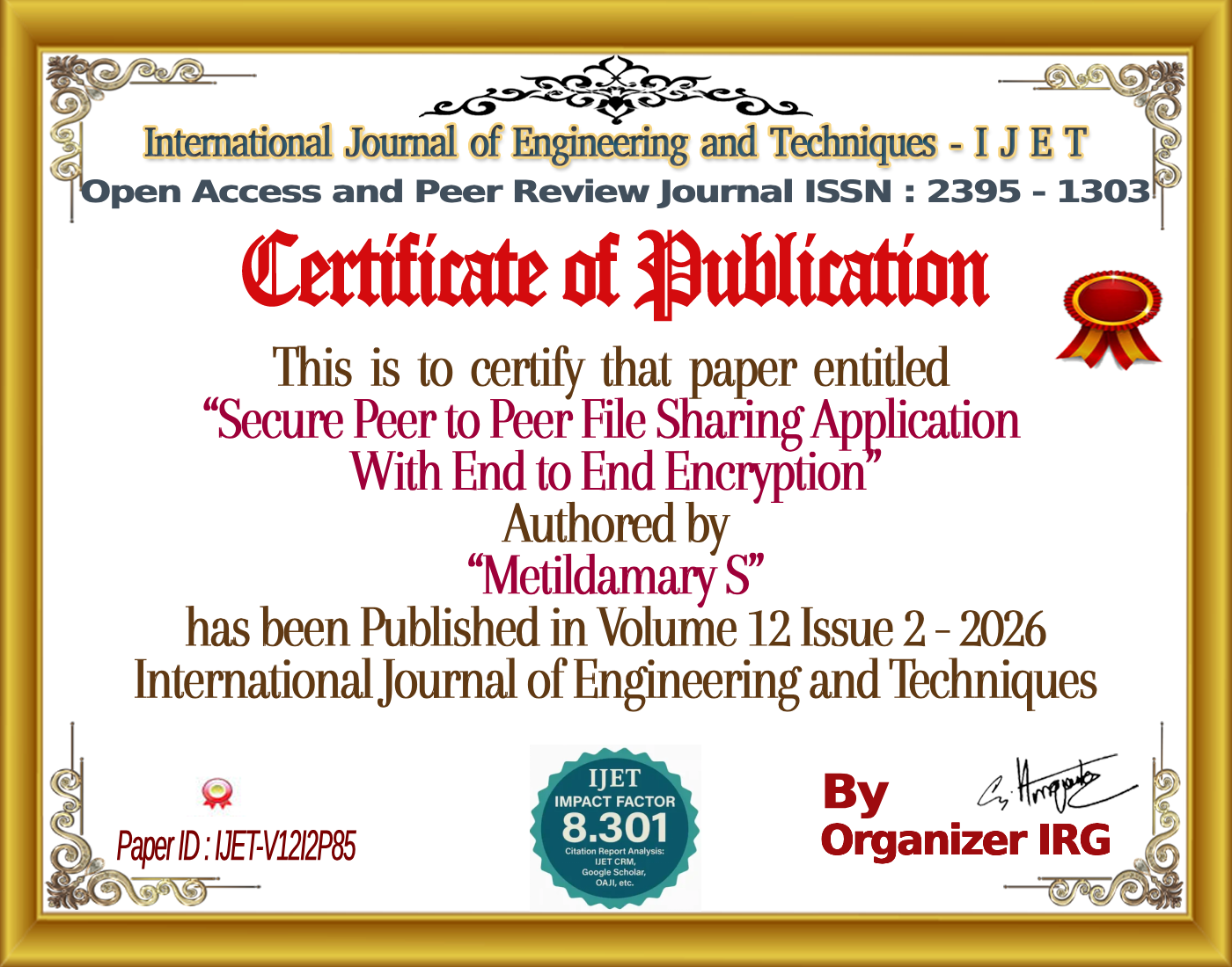 Secure Peer to Peer File Sharing Application With End to End Encryption | IJET – Volume 12 Issue 2 | IJET-V12I2P85