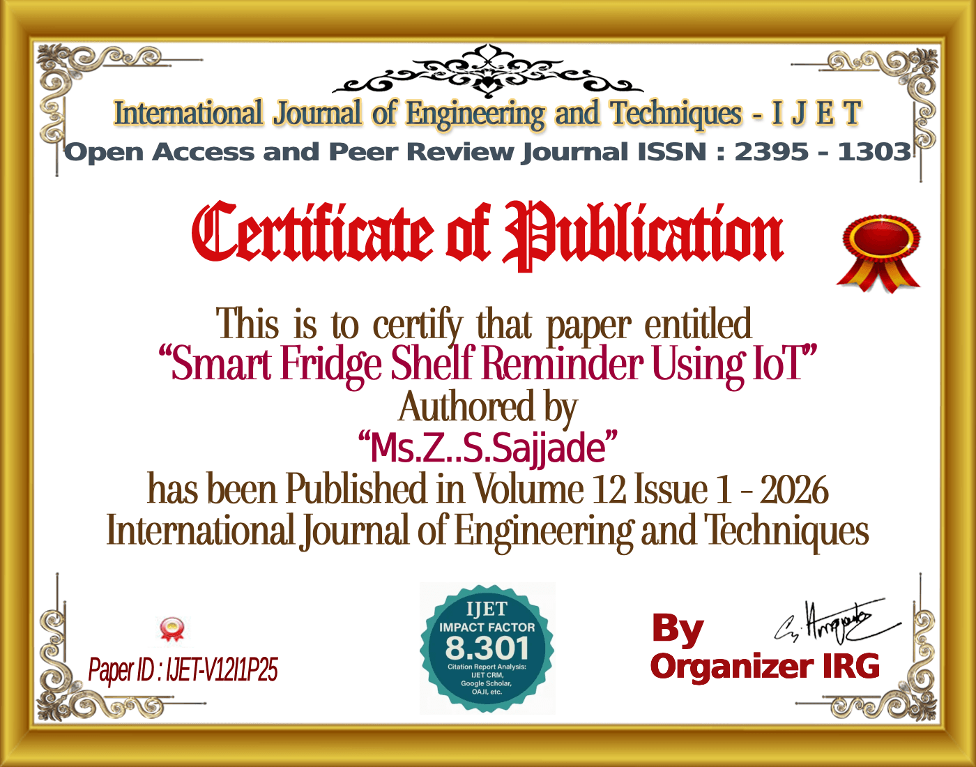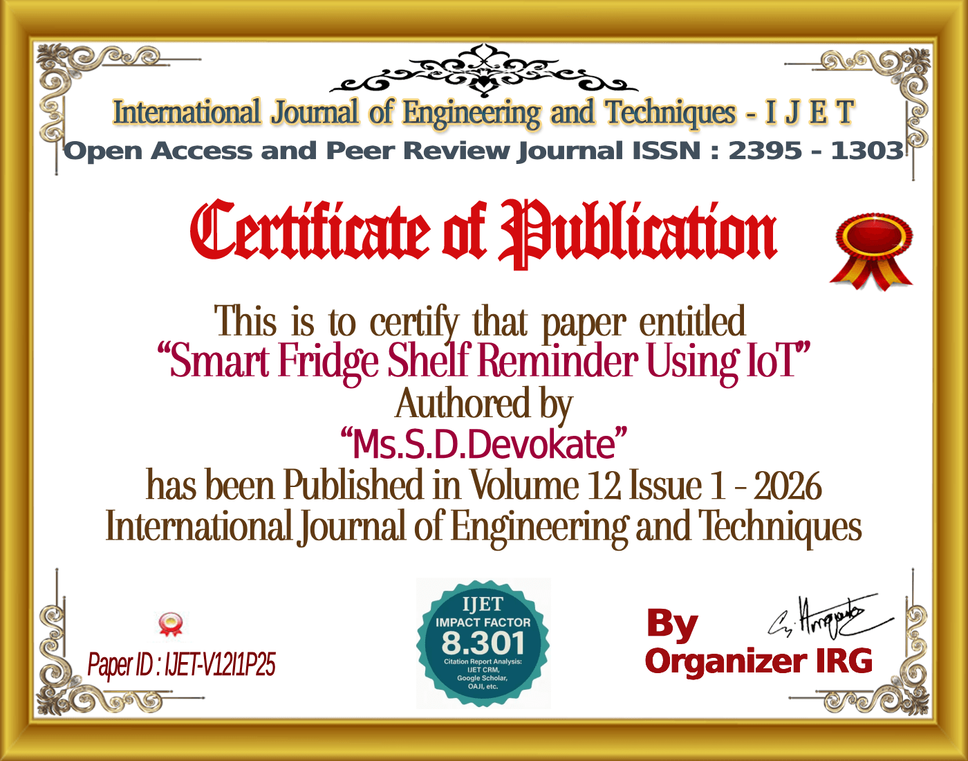 TANISHA SHINDE, SRUSHTI CHORMALE, PRANALI BANSODE, “SMART FRIDGE SHELF REMINDER USING IoT,” International Journal of Engineering and Techniques (IJET), vol. 12, no. 1, February 2026, doi: {{doi}}.