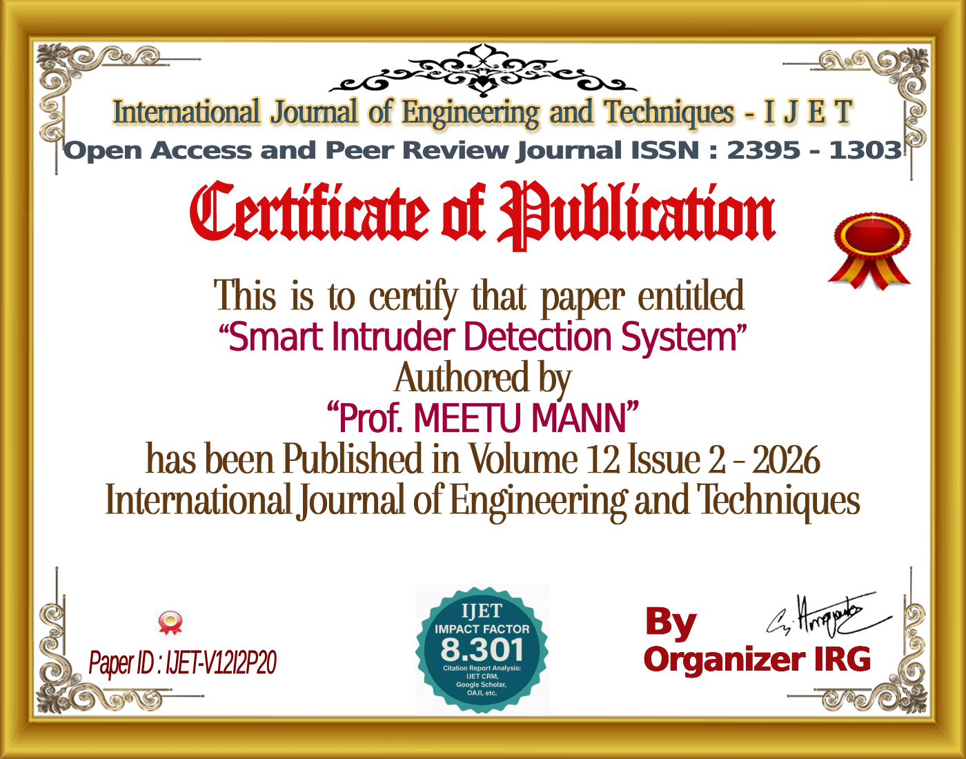 Aakash, Sneha Sharma, Yash Agrawal, Khushi Gupta, Prof. MEETU MANN (March 2026). Smart Intruder Detection System. International Journal of Engineering and Techniques (IJET), 12(2). https://doi.org/{{doi}}