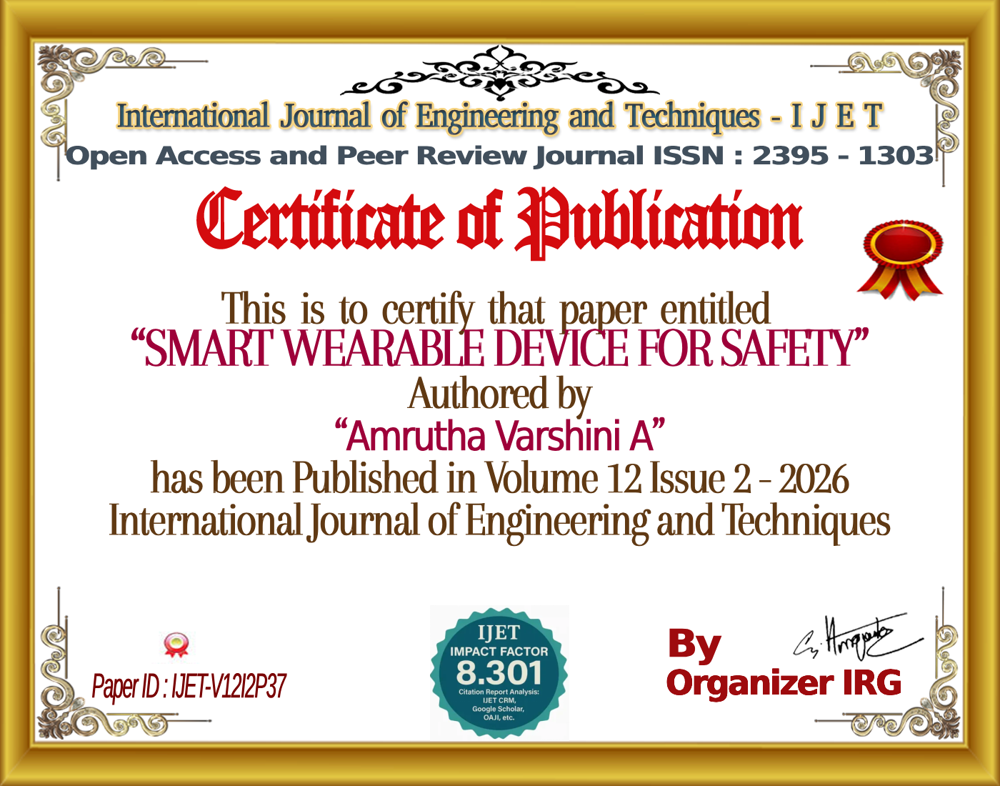 Anusha A, Devaraj Verma C, Amrutha Varshini A, Abinaya M K, Aditya Parihar, Naveen S, β€œSMART WEARABLE DEVICE FOR SAFETY,” International Journal of Engineering and Techniques (IJET), vol. 12, no. 2, March 2026, doi: https://zenodo.org/records/19387834.