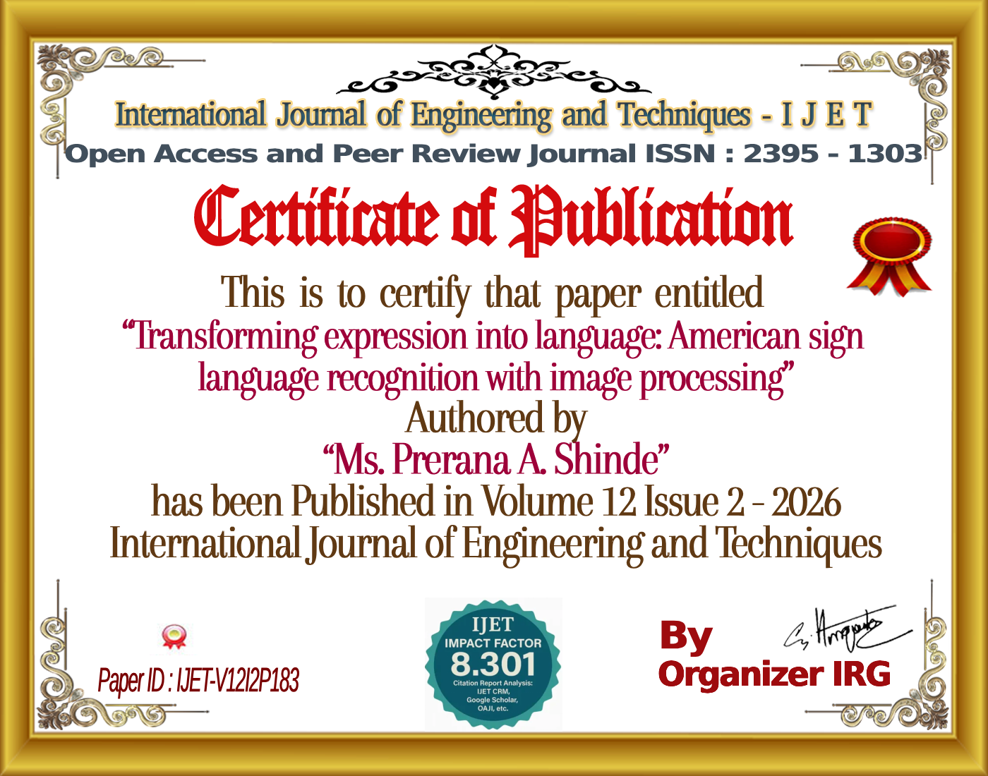 Ms. Aparna R. Pingle, Ms. Rutuja V. Patil, Ms. Prerana A. Shinde, Ms. Riya B. Waje, Prof. P.J. Patel , “Transforming expression into language: American sign language recognition with image processing,” International Journal of Engineering and Techniques (IJET), vol. 12, no. 2, April 2026, doi: {{doi}}.