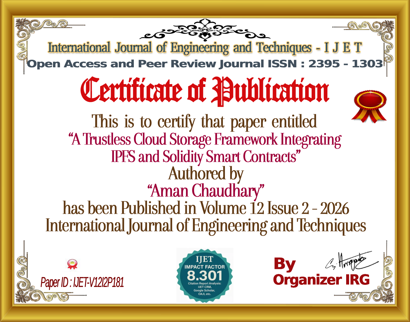 Aman Chaudhary, Bhavy Singhal, Aryan Siwach, Priyanka Dhanraj, “A Trustless Cloud Storage Framework Integrating IPFS and Solidity Smart Contracts,” International Journal of Engineering and Techniques (IJET), vol. 12, no. 2, April 2026, doi: {{doi}}.