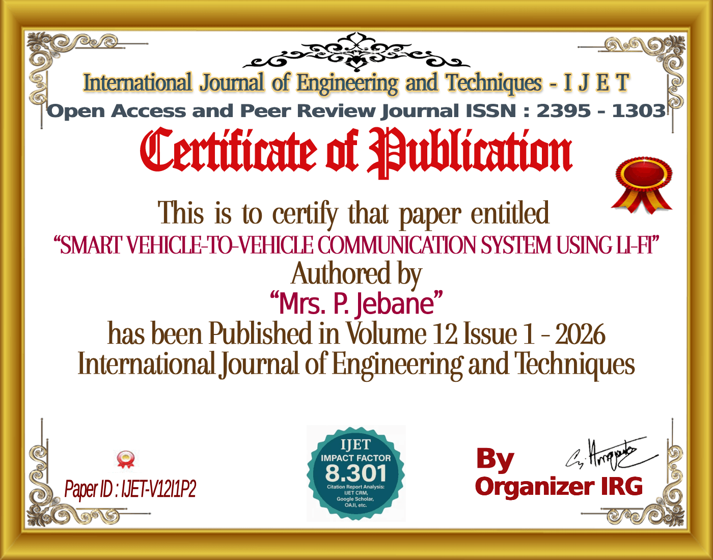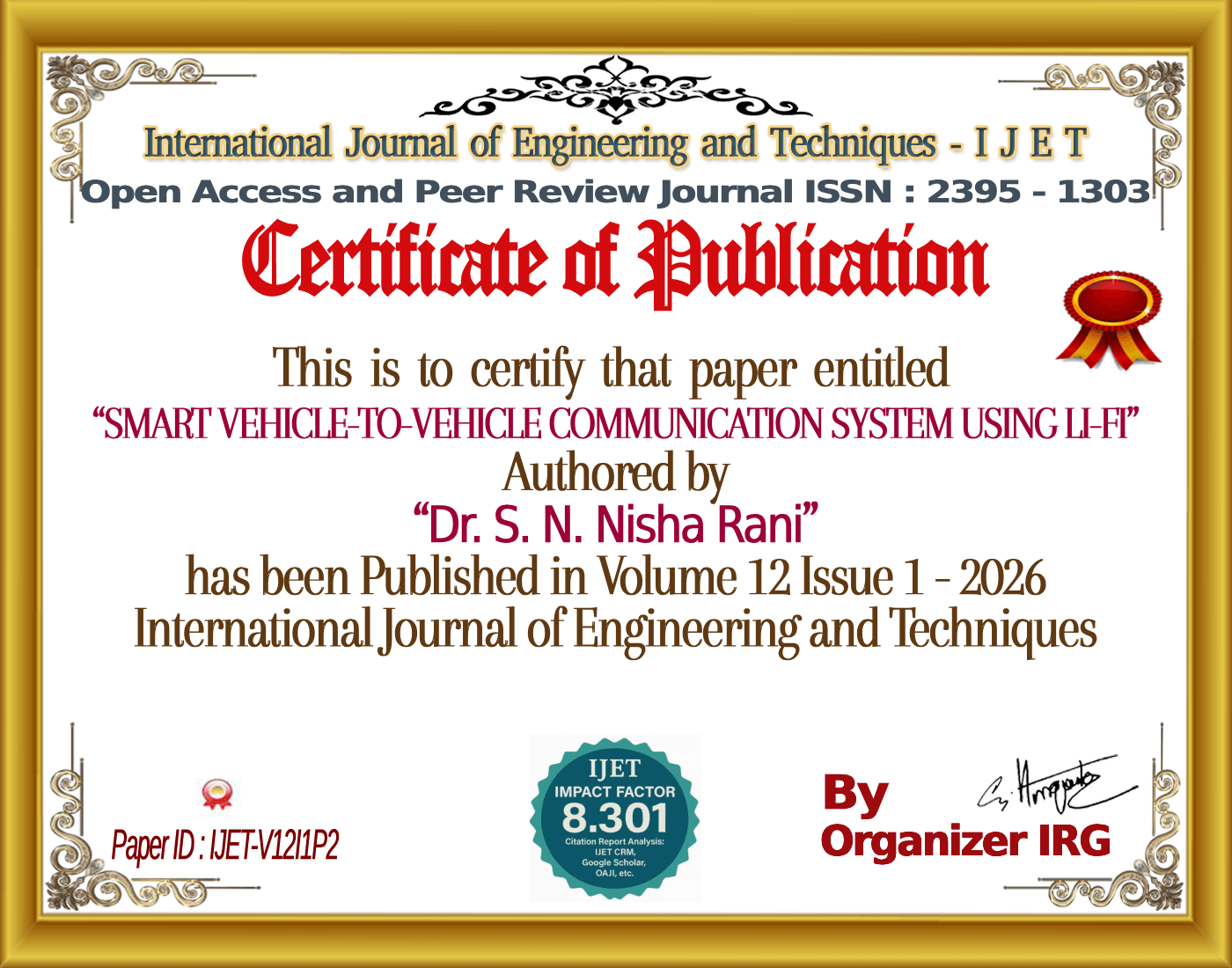 Mrs. P. Jebane, Mrs. R. Nagadeepa, Dr. S. N. Nisha Rani, Mr. M.Elayaraja, βSMART VEHICLE-TO-VEHICLE COMMUNICATION SYSTEM USING LI-FI,β International Journal of Engineering and Techniques (IJET), vol. 12, no. 1, January 2026, doi: {{doi}}.